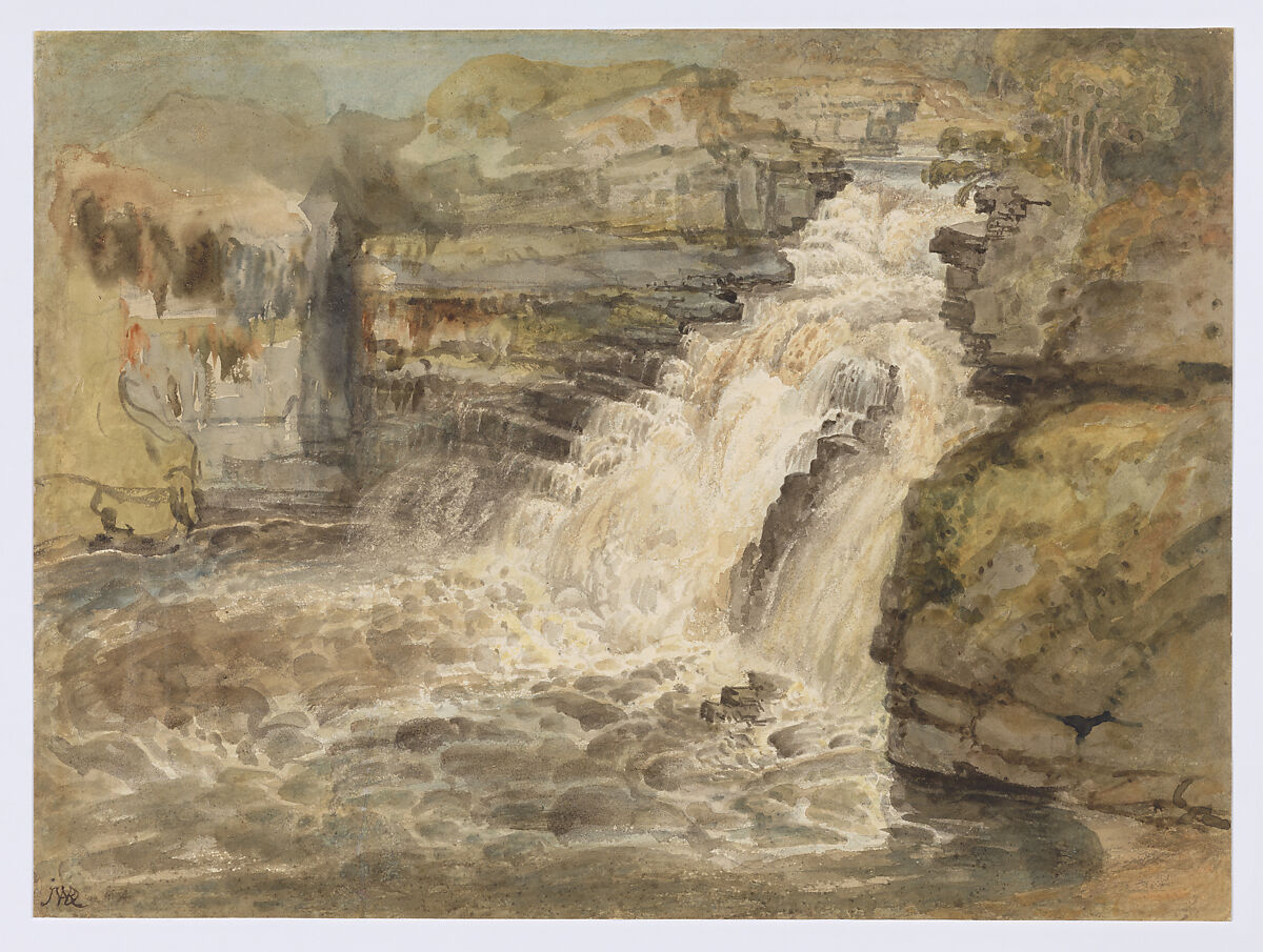 This dramatic watercolor responds to a site renowned for its natural beauty—the Falls of the River Clyde in Lanarkshire. Ward was one of Britain’s leading nineteenth-century animal painters and a powerful landscapist. He made this watercolor at a pivotal moment soon after being elected as a Royal Academician in June 1811. A walking tour of Scotland that autumn led to this waterfall, where a powerful flow of water between massive cliffs engages with forces at the heart of romantic naturalism. Around the same time, Ward began to plan Gordale Scar (1812-14, Tate), a monumental painting centered on a similar dramatic flow.