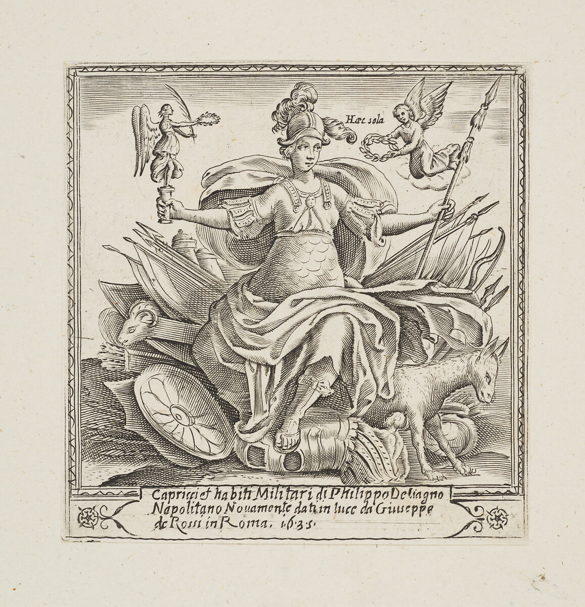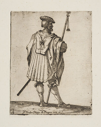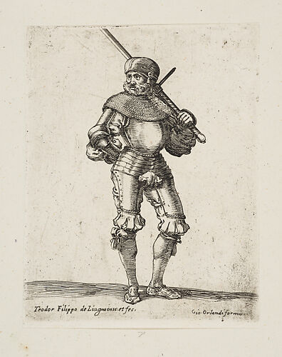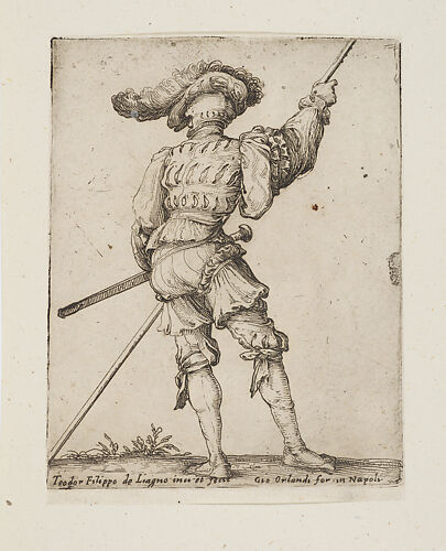 The 1635 title page that identifies Giuseppe de' Rossi as the publisher is not recorded by Bartsch. The Met has the complete series of soldiers that were originally published by Giovanni Orlandi, whose name appears on most of the prints. The only evidence for their republication is this title piece. In all other respects the prints in the series do not appear to have been modified. It is likely that the title was created simply to group the prints and sell them as a set.