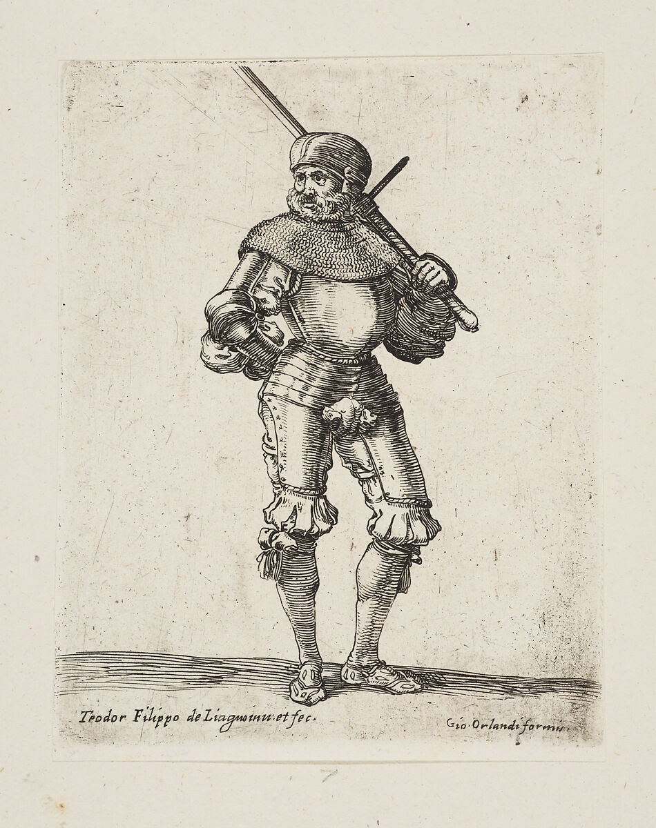 - Title:Soldier standing wearing armor, a sword resting on his shoulder, front view, from the series 'Capricci e habiti militari'