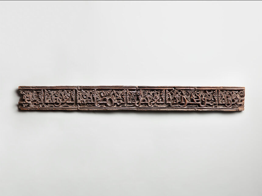 This epigraphic relief-carved wooden panel was made of cedar or pine, probably in Toledo, during the Second Taifa (567–609 AH/1172–1212 CE). The panel represents the cultural confluence among Christians, Jews, and Muslims in Toledo, as the city was captured and later ruled by King Alfonso VI of León and Castile in 478 AH/1085 CE, and Muslim woodworkers continued to ply their trade. The epigraphy consists of a deeply carved Kufic inscription, with certain letters floriated, in three layers, creating a three-dimensional effect—the first is the inscription, the second is a layer of floriated vines, and the third is the background. This technique reflects the artistry of a master workshop. The panel, which was once polychromed, had been hastily removed from its original location, and therefore, splintered, leaving the benedictory inscription incomplete. It reads: "al-ʿizza al-muftakhira al-ghibta al-muttasila, al-ʿizza al-…" ("proud glory, continual bliss, proud…"). This precise formula in the text "al-ghibta al-muttasila", "continual bliss", is exclusive to al-Andalus. A panel with this type of benedictive inscription would have been placed above an external egress or under courtyard eaves, where the owner and guests would have passed below, conveying "well wishes" and "good fortune".