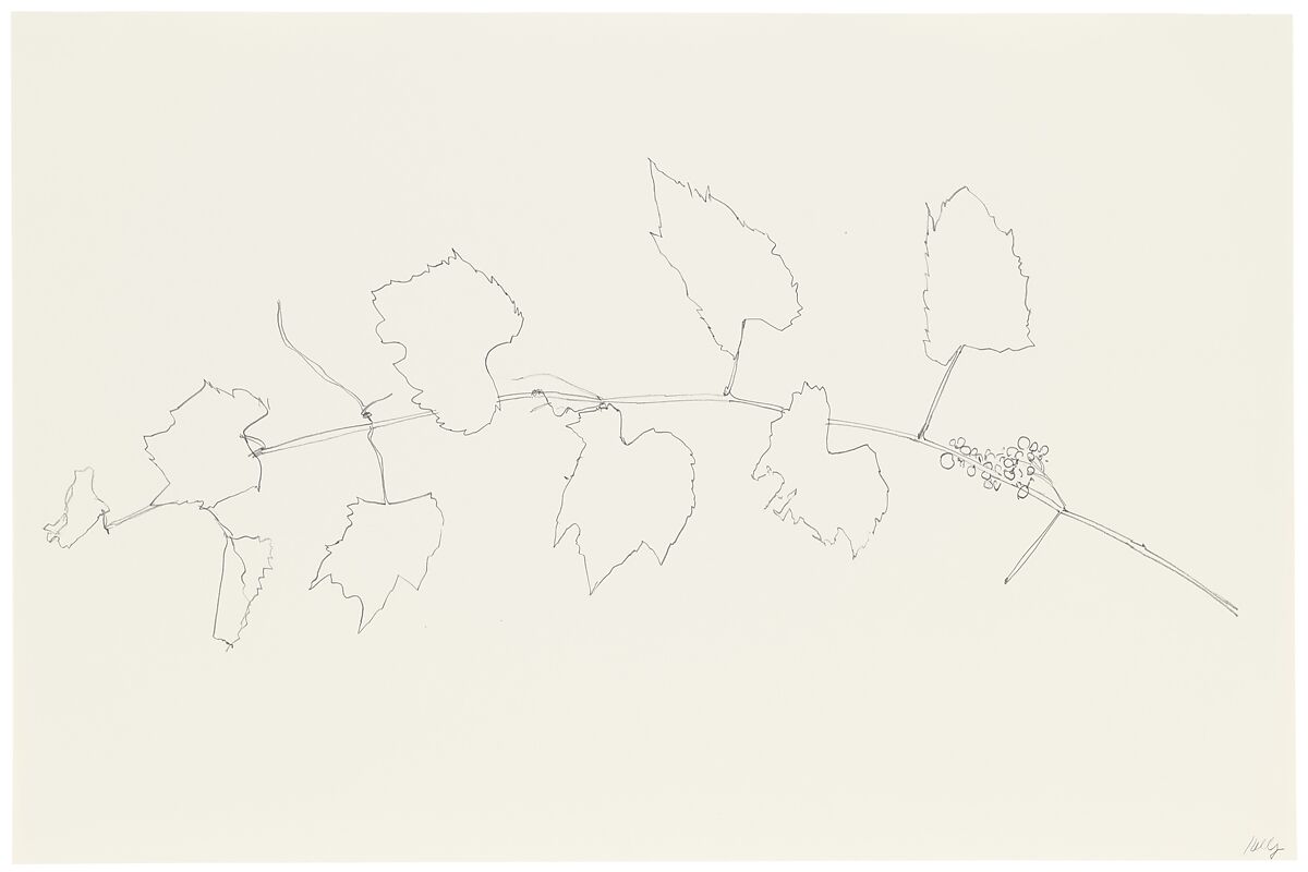 Wild Grape is a carefully rendered pencil drawing of the namesake plant, likely of a vine found by the artist. The drawing is an exercise in linework alone, with no shading, color, or contours present. Due to the interplay between parts and whole, each element of the plant possesses its own distinct sensibility. No leaf is alike in its warp and serration, while the central vine and its offshoots vary in texture and solidity. In this ode to nature, even the cluster of young grapes appears as variations on the circle. Through the use of line and detail, Kelly presents the vine as an object of contemplation. While the possible layers of interpretation—is this a formal experiment, an exercise in visual fidelity, a paean to beauty, or an homage to nature’s bounty and innovation?—are many, the subject matter at hand is resolutely straightforward and modest.
