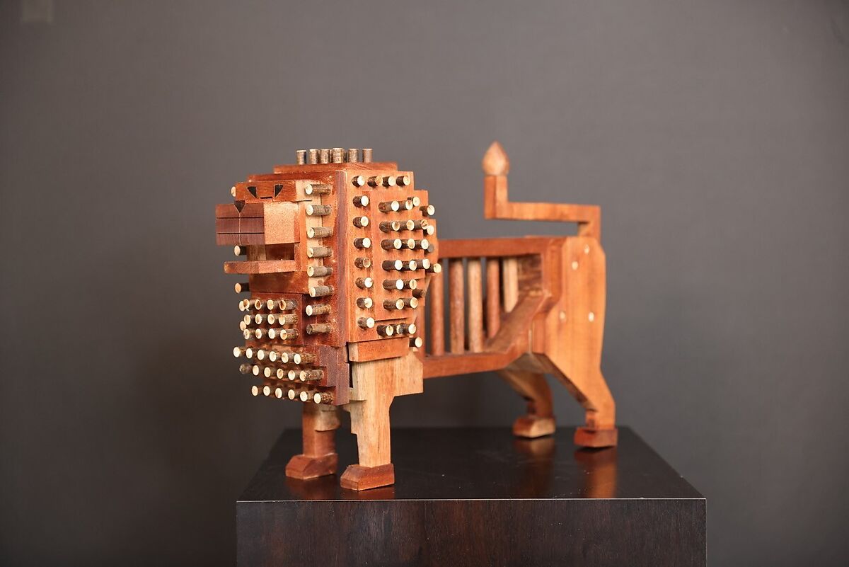 This sculpture tells an extraordinary story of the power and triumph of artistic creativity in the face of adversity. Morad Tahbaz carved each element during his six-year detainment in the Islamic Republic of Iran’s Evin prison. For him, the lion stood for the extinction and destruction of wildlife habitats in his homeland, a cause for which he strove to raise awareness by founding the Wildlife Heritage Foundation in 2008. These very activities eventually led to his arrest and incarceration. The elements were intentionally created as innocent-looking shapes that would go unnoticed by the guards and authorities, only to be assembled into majestic lion forms once they made their way out of the prison walls.