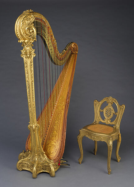 This stunning harp was made by Lyon & Healy of Chicago in 1916. It was custom made for the daughter of a wealthy Pennsylvania mine owner and its elaborate carved and gilt decorations took more than two years to create. The instrument has been played and exhibited across the country and was copied at several points in the 1920s, 1980s, and 1990s, though with simplified decorative design. The instrument is in near pristine condition and survives with its accompanying music stand and musician’s stool in a similar decorative style.
