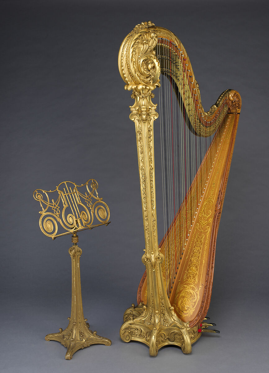 This stunning harp was made by Lyon & Healy of Chicago in 1916. It was custom made for the daughter of a wealthy Pennsylvania mine owner and its elaborate carved and gilt decorations took more than two years to create. The instrument has been played and exhibited across the country and was copied at several points in the 1920s, 1980s, and 1990s, though with simplified decorative design. The instrument is in near pristine condition and survives with its accompanying music stand and musician’s stool in a similar decorative style.