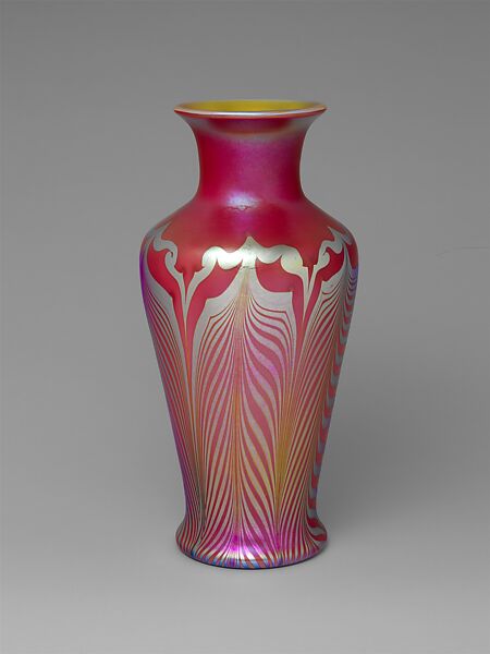 In 1924, having learned new techniques and formulas from workers at Brooklyn’s Quezal factory, Victor Durand added art glass to his predominantly commercial output at Vineland Flint Glass Works. He produced simple shapes with iridescent, Art Nouveau–inspired decoration, such as this vase.