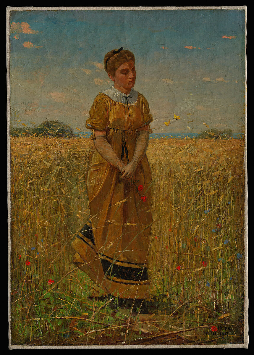 In 1867, Homer spent about ten months in France. Based in Paris, he visited the French countryside and painted a series of oils focusing on the theme of rural life and labor, stimulated by his interest in French Barbizon painters, then popular in the United States. In Homer’s picturesque painting, the young woman walks through a dense field of rye under bright skies. Her golden yellow dress echoes the tones of the tall grass in the sunlight. She clutches her hands, carrying a few red blossoms, as her skirt seems to swirl behind her. Despite the idyllic innocence of Homer’s painting, contemporary viewers might have recognized the title and subject as a reference to a poem by the Scotsman Robert Burns (1759-1796), Comin Thro’ The Rye (1784), a bawdy recounting of a young woman’s encounter with a lover in a field that was set to music, becoming a popular ballad. The painting is one of many works by Homer from this period titled after poems and songs that may have suggested deeper narratives for audiences when shown in New York in 1873.