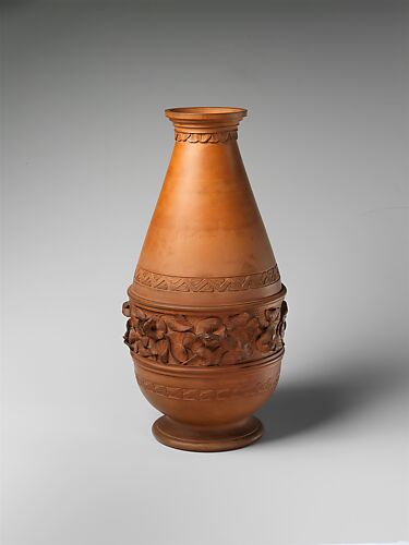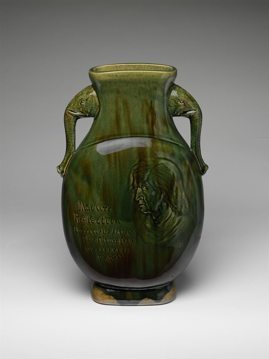 This vase is stamped with the monogram "HCR," for Hugh Cornwall Robertson, one of the sons of the founder of the Chelsea Keramic Art Works. The flattened-oval shape with elephant-head handles is most likely influenced by Chinese forms that Hugh Robertson would have seen when he visited the Centennial Exhibition in Philadelphia in 1876. The front of the vase is decorated with an incised male portrait and inscribed with the motto: "Mature Reflection Corrects the Actions of the Future from the Errors of the Past." This vase is typical of the pottery’s production in incorporating Asian influences into its forms and decoration. For other examples by this pottery see 69.35, 69.38.2, 1982.440.1–.4, 1992.231, and L.1983.52.