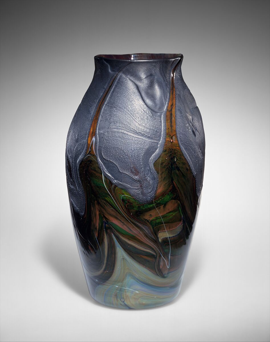 This object forms part of a group of over forty given to the Museum in 1896 by Louisine and Henry Osborne Havemeyer (96.17.9–.56). The gift was the first American glass to enter the Museum's collection. Most likely prompted by Louis Comfort Tiffany, the Havemeyers presented their collection of Tiffany Favrile glass to the Museum only three years after Tiffany started making decorative blown-glass vessels. The shapes, colors, and finishes of Tiffany's vases and plaques were inspired by the natural world and ancient glass.