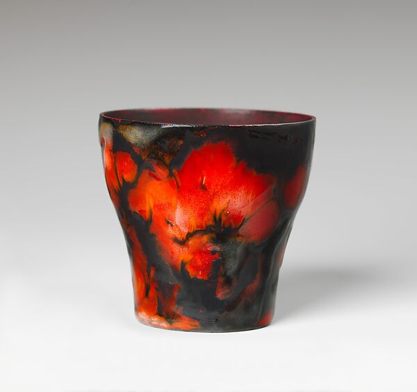 Exhibiting one of the most surprising designs on all of Tiffany’s known enamelwork, this diminutive vase features dazzling bursts of abstract fiery red poppy blossoms on a nearly black ground. Its modest size belies the dramatic impact of the vase, which Tiffany illustrated in a color plate of the sumptuous publication celebrating his oeuvre, The Art Work of Louis C. Tiffany, published in 1914.