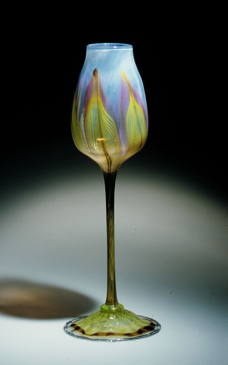This object forms part of a group of over forty given to the Museum in 1896 by Louisine and Henry Osborne Havemeyer (96.17.9–.56). The gift was the first American glass to enter the Museum's collection. Most likely prompted by Louis Comfort Tiffany, the Havemeyers presented their collection of Tiffany Favrile glass to the Museum only three years after Tiffany started making decorative blown-glass vessels. The shapes, colors, and finishes of Tiffany's vases and plaques were inspired by the natural world and ancient glass. This is one of the earliest flower form vases from Tiffany’s furnaces.