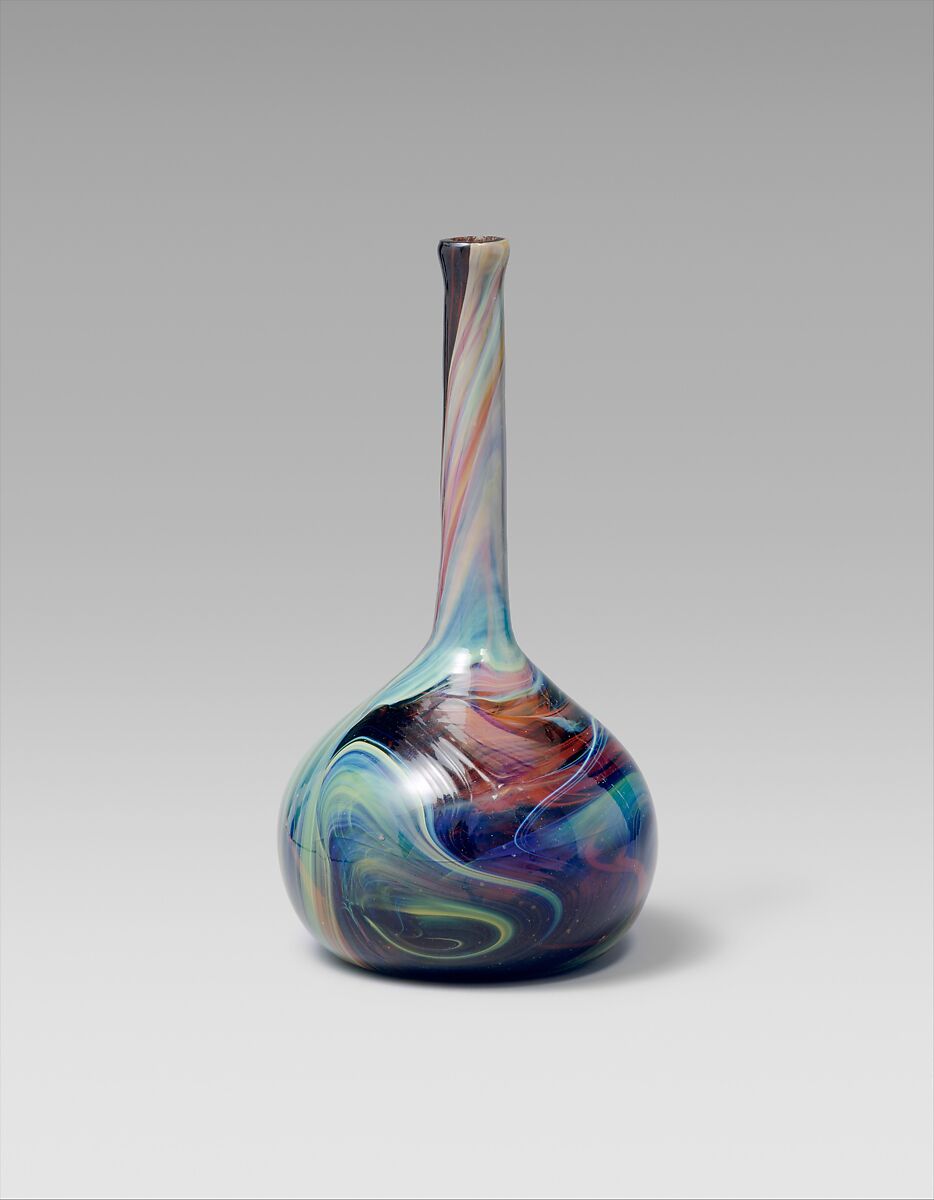 The diminutive vase, with its marbleized hues of blues, purples, greens, and reds, is among the earliest documented examples of Tiffany's work in blown glass.