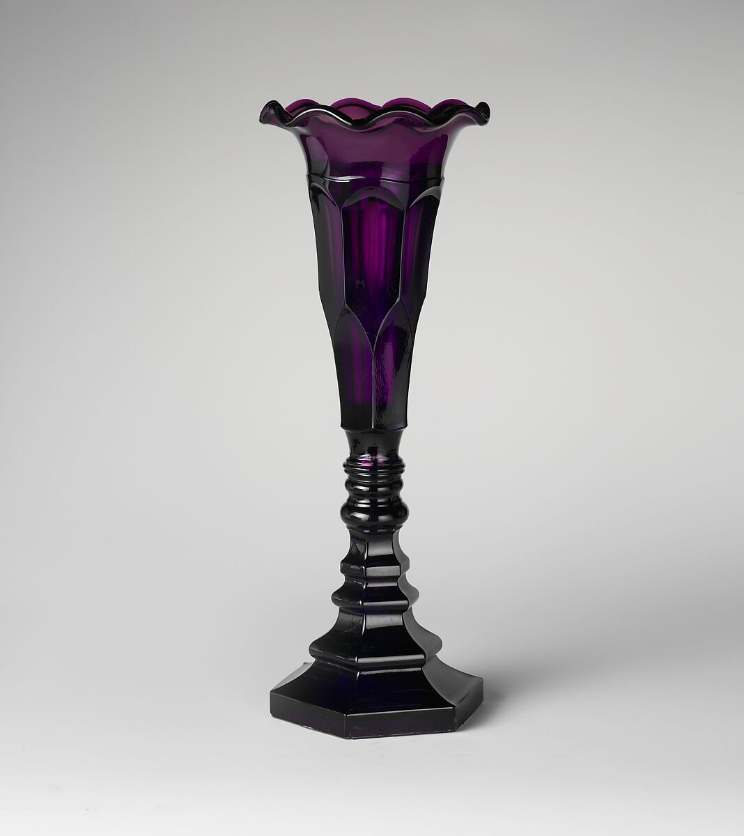 This vase was pressed in two pieces, and a flat disk was used to join the bowl to the stem. This technique is believed to have been largely confined to New England glasshouses. By 1875, a Pittsburgh firm, Atterbury and Company, had developed a process for pressing such forms in a single mold.