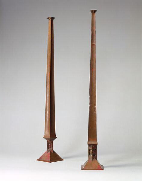Wright designed these copper vases that he called "weed holders" and displayed them in his own home in Oak Park, Illinois, as well as in several other of his residential commissions. While this pair is not the set the Littles owned, their daughter Eleanor Stevenson, in a letter to the Museum dated January 1974, described some of the room’s original furnishings and sketched a vase like these, characterizing it as "excessively tall." She wrote that the family had a pair of such vases placed "in the recesses of the fireplace."