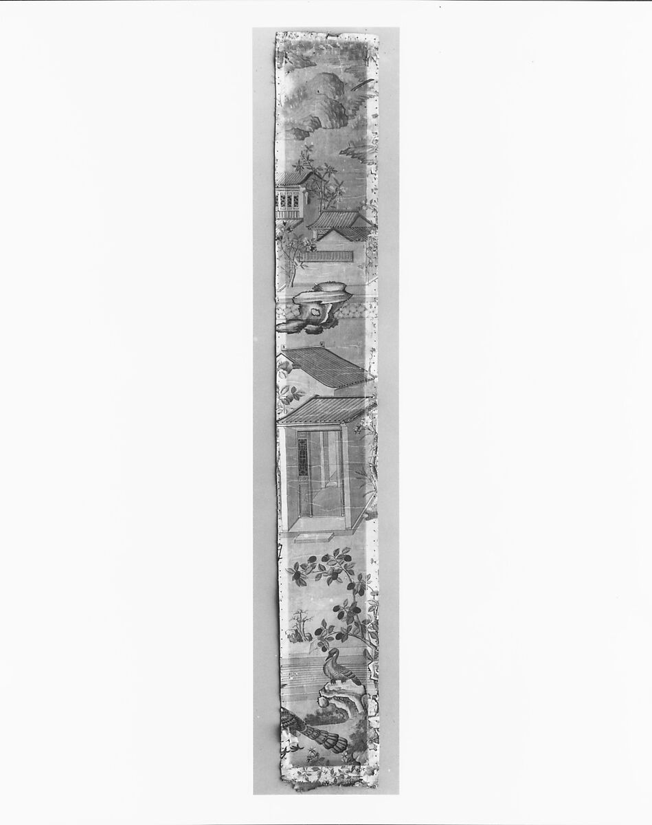 This wallpaper panel is part of a set originally consisting of seventeen pieces (see 14.106.1–.16 for set.). The panels depict mountain landscapes, scenes with houses, birds, and flowering shrubs. They were hand-painted in China during the early eighteenth century for export to England. There, as in America, such exotic wallpaper enjoyed a vogue among the fashionable gentry. Considered a great luxury, it added richness and colors to walls. This wallpaper hung in an English home for two hundred years. The panels are installed, in whole or in part, in the Powel Room in The American Wing.