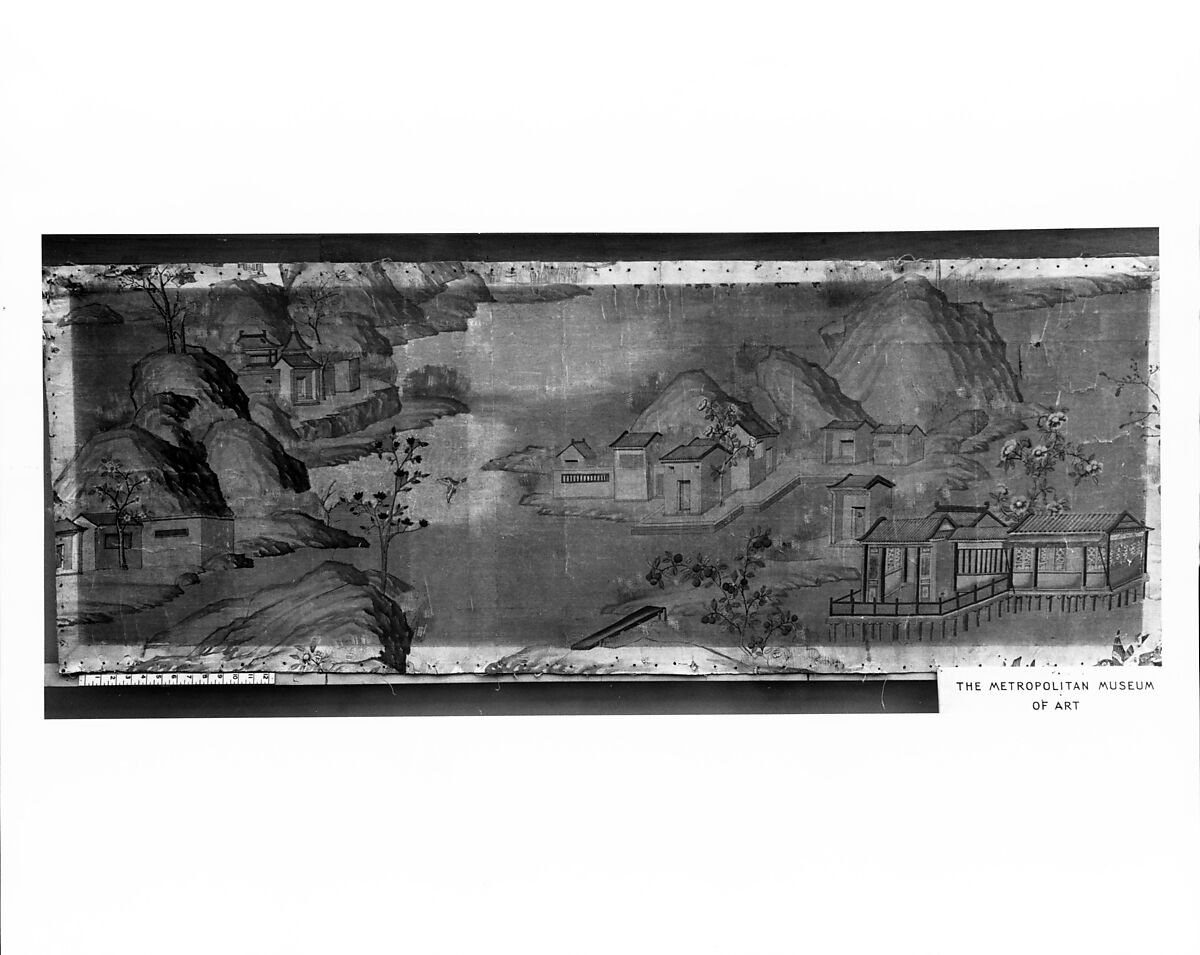 This wallpaper panel is part of a set originally consisting of seventeen pieces (see 14.106.1–.16 for set.). The panels depict mountain landscapes, scenes with houses, birds, and flowering shrubs. They were hand-painted in China during the early eighteenth century for export to England. There, as in America, such exotic wallpaper enjoyed a vogue among the fashionable gentry. Considered a great luxury, it added richness and colors to walls. This wallpaper hung in an English home for two hundred years. The panels are installed, in whole or in part, in the Powel Room in The American Wing.