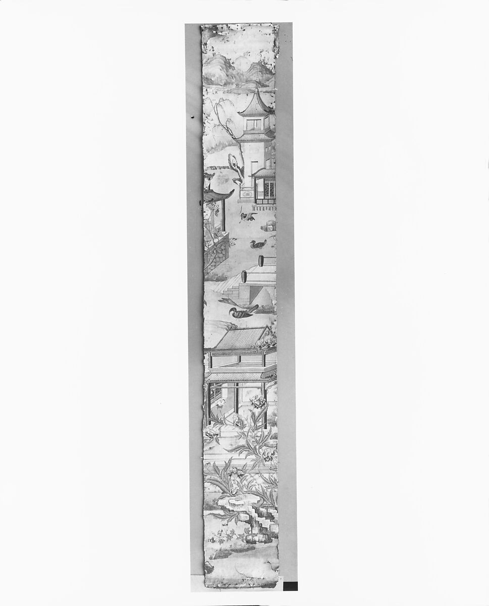 This wallpaper panel is part of a set originally consisting of seventeen pieces (see 14.106.1–.16 for set.). The panels depict mountain landscapes, scenes with houses, birds, and flowering shrubs. They were hand-painted in China during the early eighteenth century for export to England. There, as in America, such exotic wallpaper enjoyed a vogue among the fashionable gentry. Considered a great luxury, it added richness and colors to walls. This wallpaper hung in an English home for two hundred years. The panels are installed, in whole or in part, in the Powel Room in The American Wing.