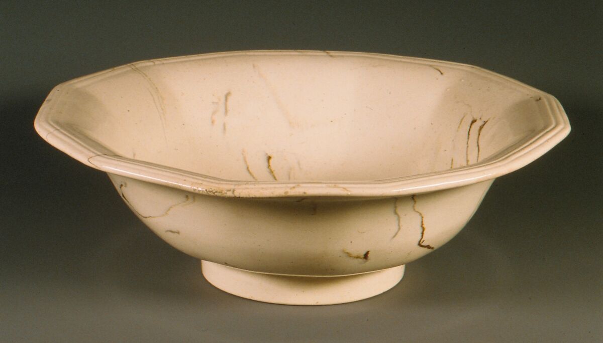 This basin and its matching basin 1983.206.2 are made of "scroddled" ware, or "lava" ware, as it was called in advertisements in the nineteenth century.