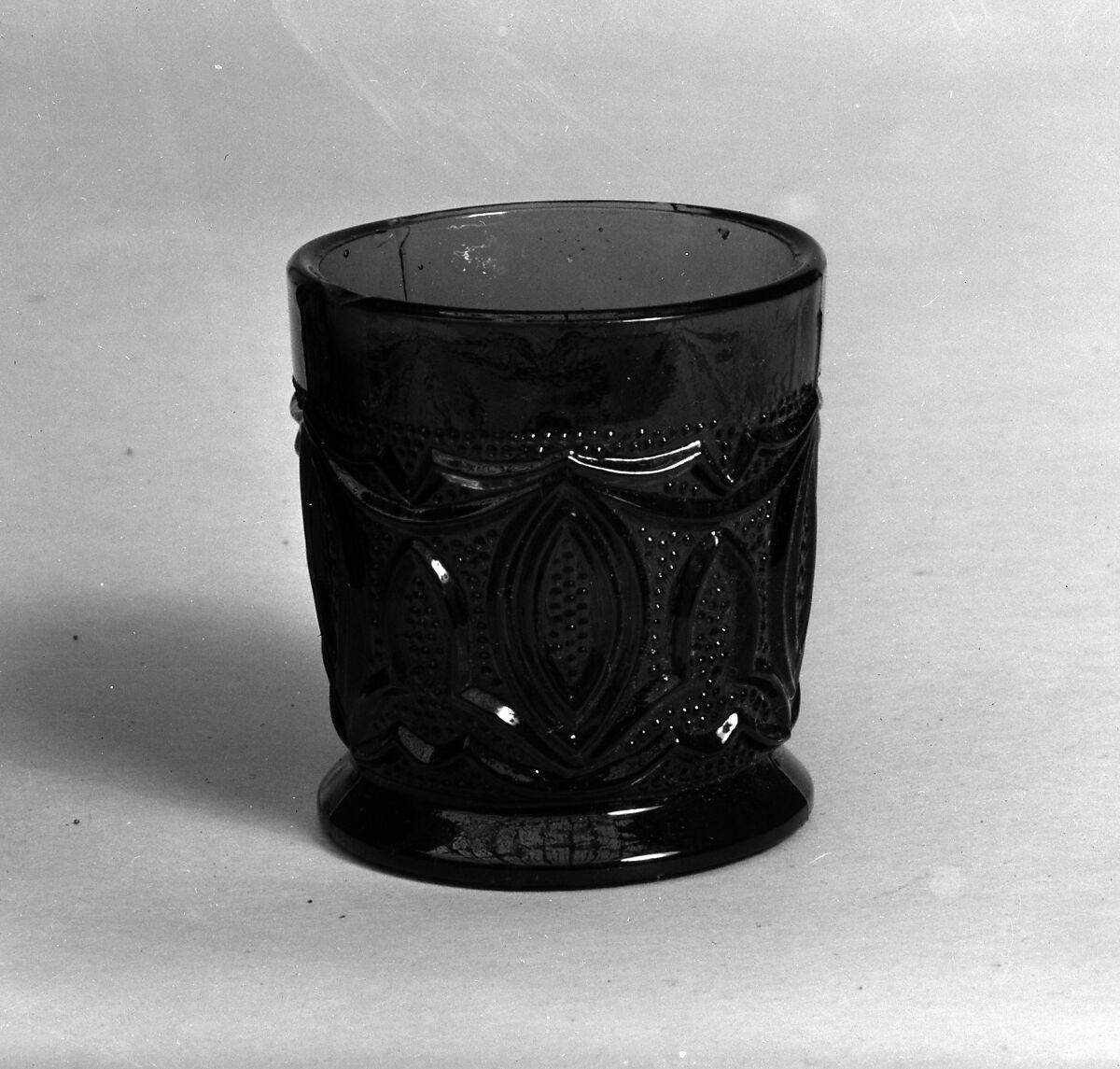 Lancet leaves are pressed in a design around the body of this cylindrical whiskey taster.