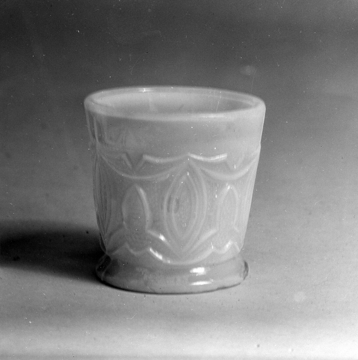 Lancet leaves are pressed in a design around the body of this cylindrical whiskey taster.