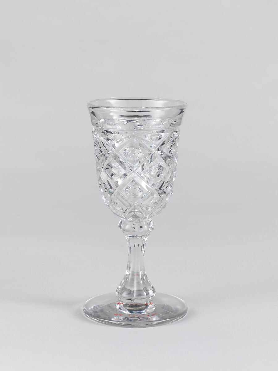With the development of new formulas and techniques, glass-pressing technology had improved markedly by the late 1840s. By this time, pressed tablewares were being produced in large matching sets and innumerable forms. During the mid-1850s, colorless glass and simple geometric patterns dominated. Catering to the demand for moderately-priced dining wares, the glass industry in the United States expanded widely, and numerous factories supplied less expensive pressed glassware to the growing market. At the Exhibition of the Industry of All Nations at New York’s Crystal Palace in 1853, for example, the New England Glass Company exhibited 130 pieces of one design, "consisting of bowls, tumblers, champagnes, wines, and jelly glasses." This object belongs to one such service. Although the glass manufactory is not known, the glassware is very typical of the large services that were very popular with America’s middle class in the nineteenth century.