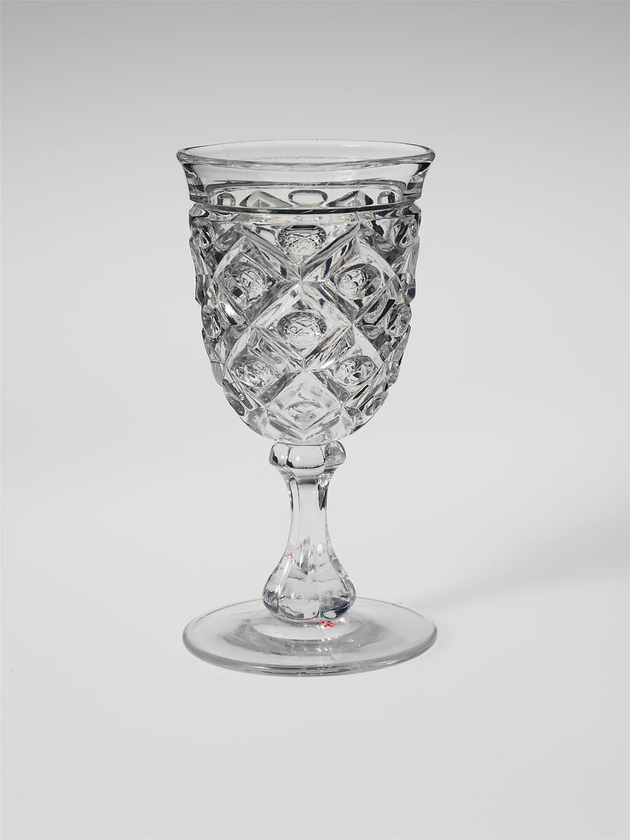 With the development of new formulas and techniques, glass-pressing technology had improved markedly by the late 1840s. By this time, pressed tablewares were being produced in large matching sets and innumerable forms. During the mid-1850s, colorless glass and simple geometric patterns dominated. Catering to the demand for moderately-priced dining wares, the glass industry in the United States expanded widely, and numerous factories supplied less expensive pressed glassware to the growing market. At the Exhibition of the Industry of All Nations at New York’s Crystal Palace in 1853, for example, the New England Glass Company exhibited 130 pieces of one design, "consisting of bowls, tumblers, champagnes, wines, and jelly glasses." This object belongs to one such service. Although the glass manufactory is not known, the glassware is very typical of the large services that were very popular with America’s middle class in the nineteenth century.