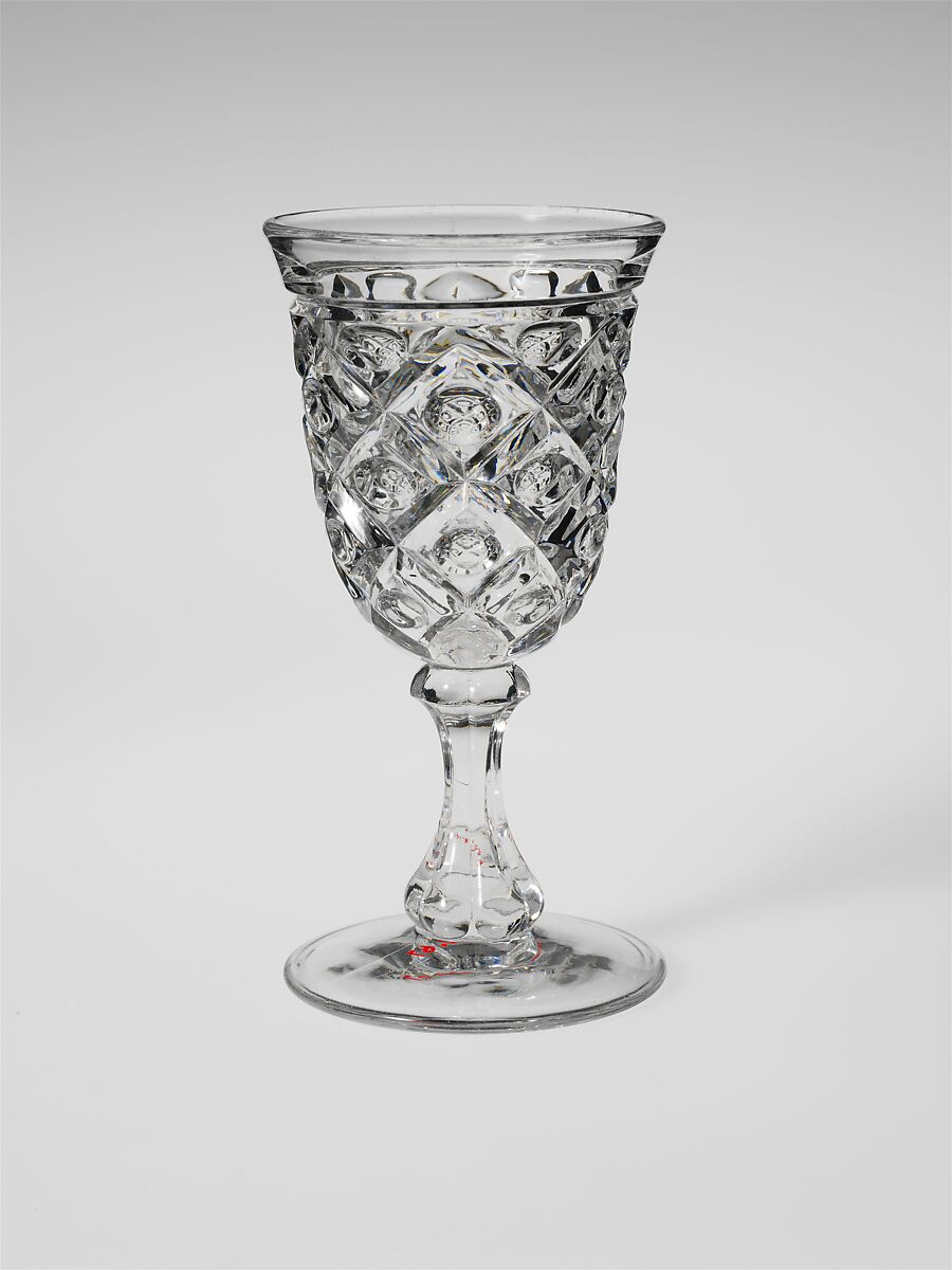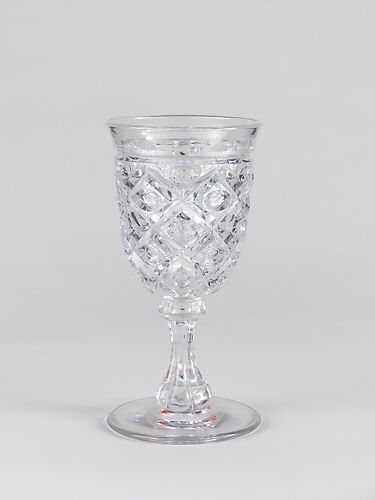 With the development of new formulas and techniques, glass-pressing technology had improved markedly by the late 1840s. By this time, pressed tablewares were being produced in large matching sets and innumerable forms. During the mid-1850s, colorless glass and simple geometric patterns dominated. Catering to the demand for moderately-priced dining wares, the glass industry in the United States expanded widely, and numerous factories supplied less expensive pressed glassware to the growing market. At the Exhibition of the Industry of All Nations at New York’s Crystal Palace in 1853, for example, the New England Glass Company exhibited 130 pieces of one design, "consisting of bowls, tumblers, champagnes, wines, and jelly glasses." This object belongs to one such service. Although the glass manufactory is not known, the glassware is very typical of the large services that were very popular with America’s middle class in the nineteenth century.