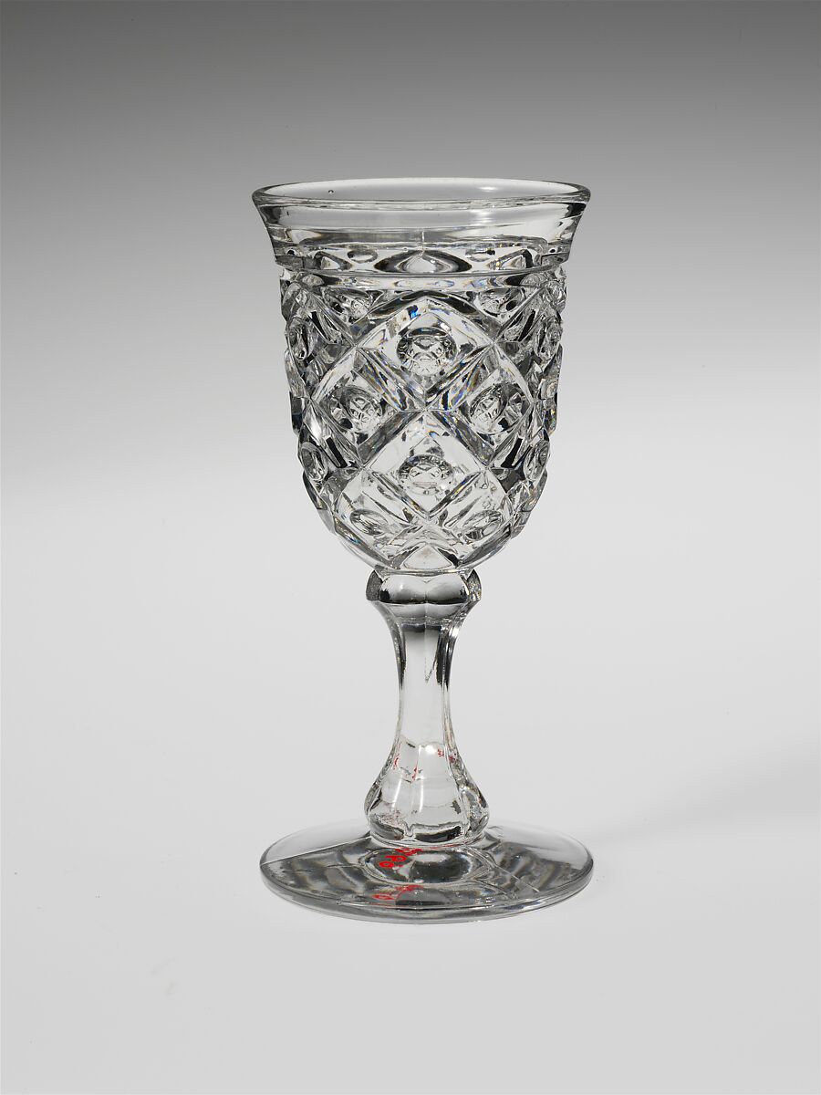 With the development of new formulas and techniques, glass-pressing technology had improved markedly by the late 1840s. By this time, pressed tablewares were being produced in large matching sets and innumerable forms. During the mid-1850s, colorless glass and simple geometric patterns dominated. Catering to the demand for moderately-priced dining wares, the glass industry in the United States expanded widely, and numerous factories supplied less expensive pressed glassware to the growing market. At the Exhibition of the Industry of All Nations at New York’s Crystal Palace in 1853, for example, the New England Glass Company exhibited 130 pieces of one design, "consisting of bowls, tumblers, champagnes, wines, and jelly glasses." This object belongs to one such service. Although the glass manufactory is not known, the glassware is very typical of the large services that were very popular with America’s middle class in the nineteenth century.
