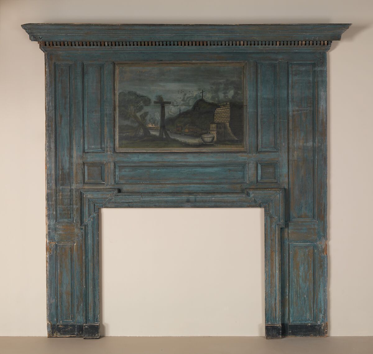 This overmantel was painted as an integral part of the woodwork interior for a Lancaster County, Pennsylvania, farmhouse in about 1761. (See 34.27.10 for further information on the woodwork.) The subject of this overmantel painting was taken from an engraving which appeared in William Salmon's "Polygraphice or the Arts of Drawing, Engraving . . .” (London, 1685), one of the first books of artistic instruction used in America.