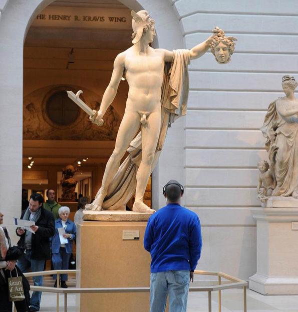 A visitor enjoying the Audio Guide entry for Antonio Canova's Perseus with the Head of Medusa, The Metroplitan Museum of Art, New York, Fletcher Fund, 1967 (67.110.1).