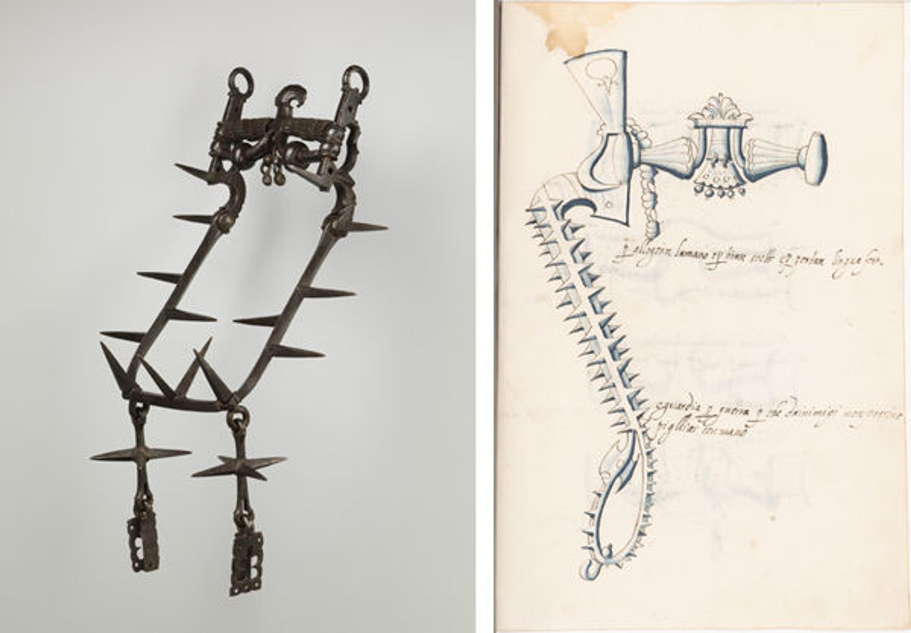 Left: Curb Bit, 16th century. Possibly French. Iron. The Metropolitan Museum of Art, New York, Gift of William H. Riggs, 1913 (14.25.1800). Right: Spiked Curb Bit. Illustration from an anonymous 16th-century Italian manuscript. Pen and wash on paper. Library of the Department of Arms and Armor, The Metropolitan Museum of Art