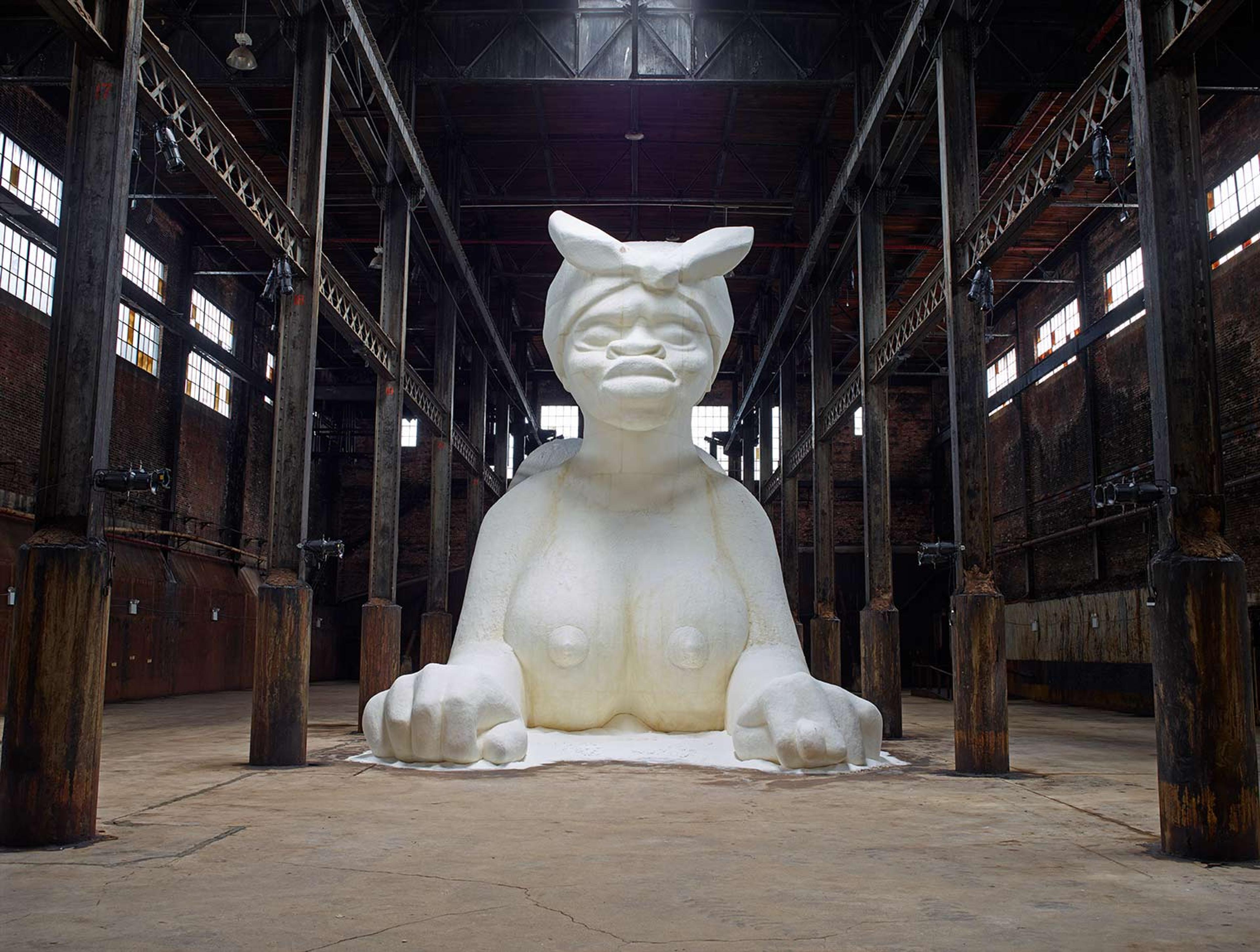 Kara Walker (American, 1969–). A Subtlety, or the Marvelous Sugar Baby, an Homage to the unpaid and overworked Artisans who have refined our Sweet tastes from the cane fields to the Kitchens of the New World on the Occasion of the demolition of the Domino Sugar Refining Plant, 2014. Polystyrene foam, sugar, approx. 35.5 x 26 x 75.5 feet (10.8 x 7.9 x 23 m). Installation view: Domino Sugar Refinery, A project of Creative Time, Brooklyn, NY, 2014. Photo: Jason Wyche, courtesy of Sikkema Jenkins & Co., New York. Artwork © Kara Walker