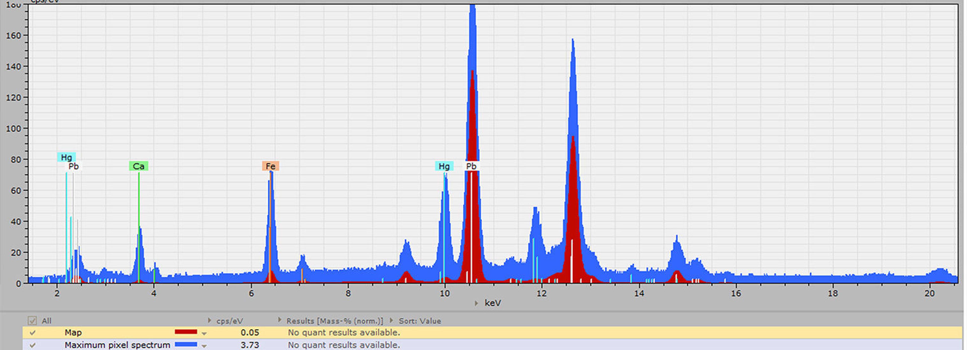 X-ray fluorescence spectra acquired in an area above Madame Lavoisier’s head, showing peaks characteristic of elements composing the pigments in the visible paints and in the early composition hidden below the surface. Calculating and plotting the information contained in these spectra results in elemental distribution maps. Originally published by S.A. Centeno, D. Mahon, F. Carò and D. Pullins, Heritage Science (Springer Open), 2021.