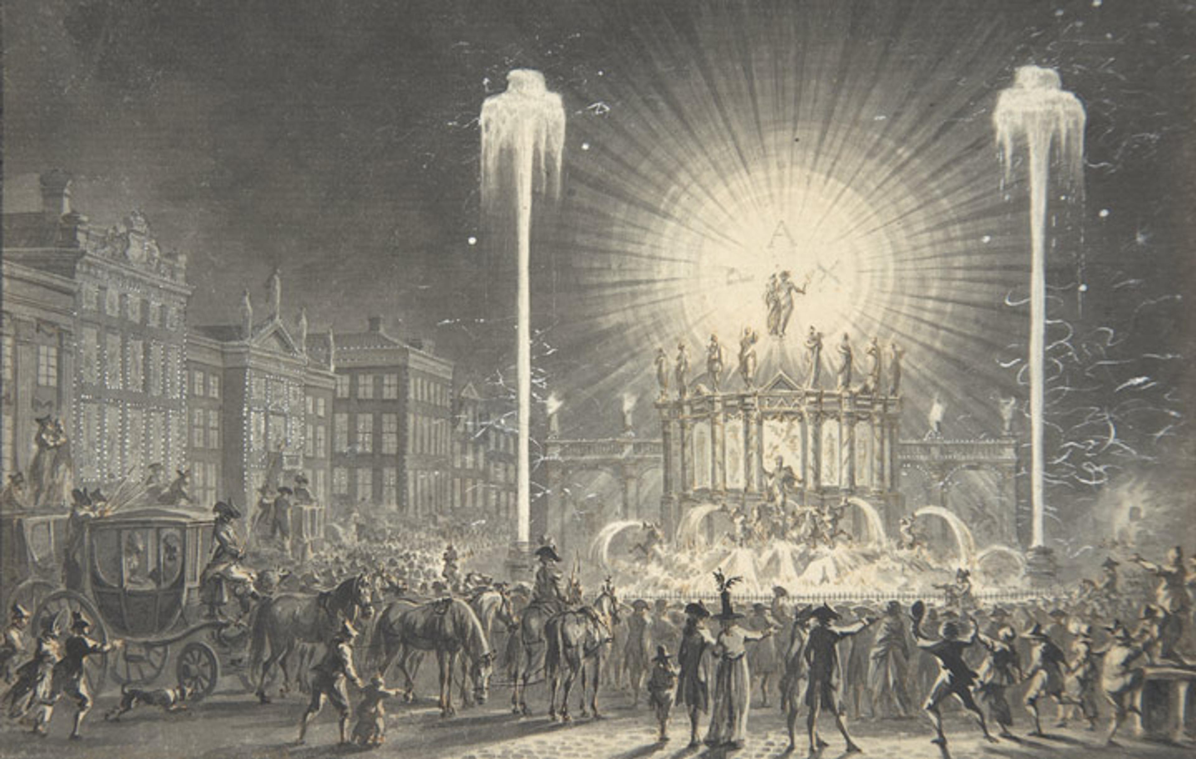 Dirk Langendijk (Dutch, 1748–1805). City Square with Fireworks, ca. 1796. Brush and gray ink, pen and brown ink, with white heightening; 4 5/16 x 6 9/16 in. (11.0 x 16.7 cm). The Metropolitan Museum of Art, New York, Purchase, Susan H. Seidel Gift, 2000 (2000.30)