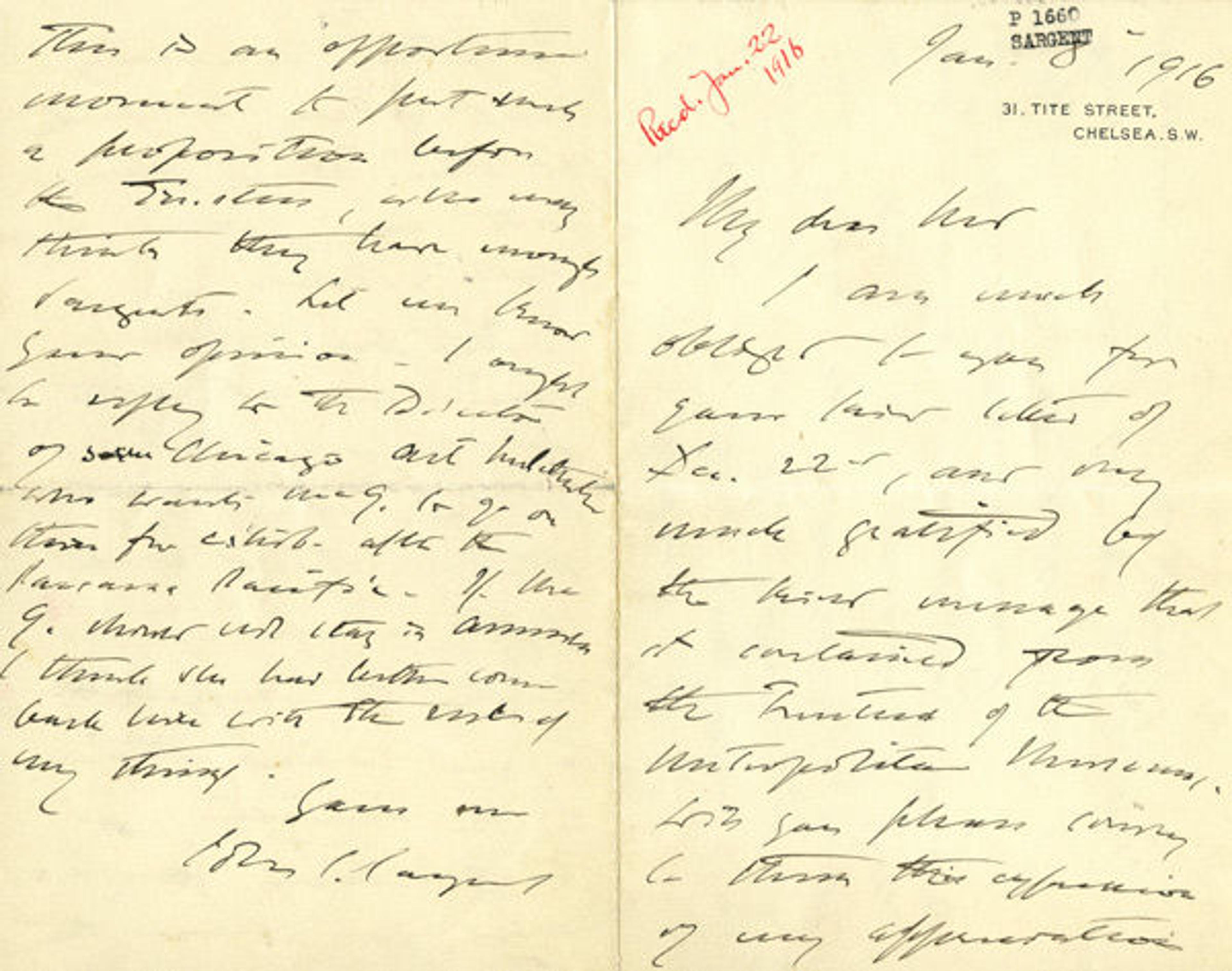 Sargent's letter to former Director Ned Robinson, January 8, 1916.[2] The Metropolitan Museum of Art Archives