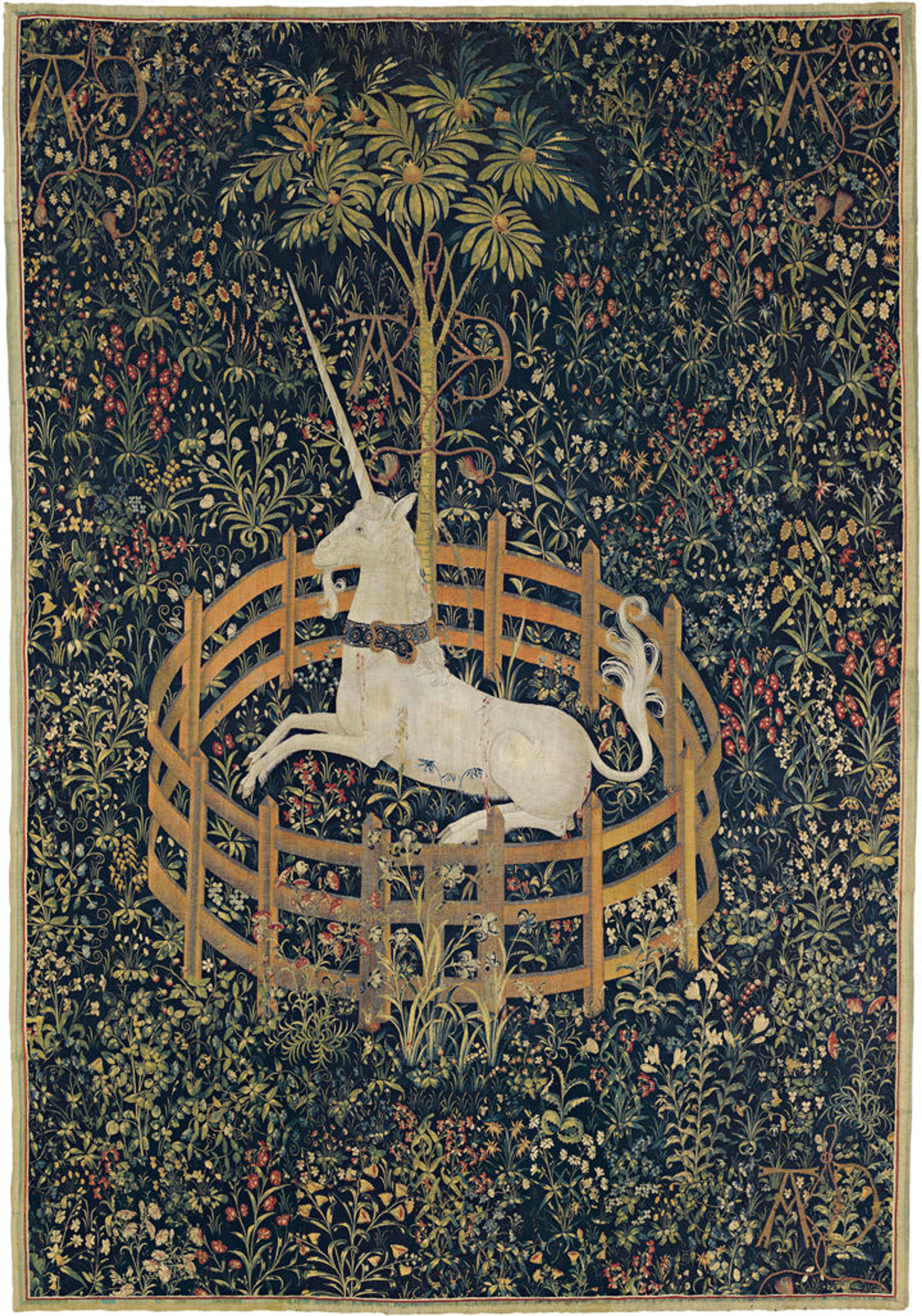 The Unicorn Tapestries are well-known examples of medieval secular art in The Met collection. The Unicorn in Captivity (from the Unicorn Tapestries), ca. 1495–1505. South Netherlandish. Wool warp with wool, silk, silver, and gilded wefts, Overall: 144 7/8 x 99 in. (368 x 251.5 cm). The Metropolitan Museum of Art, New York, Gift of John D. Rockefeller Jr., 1937 (37.80.6)