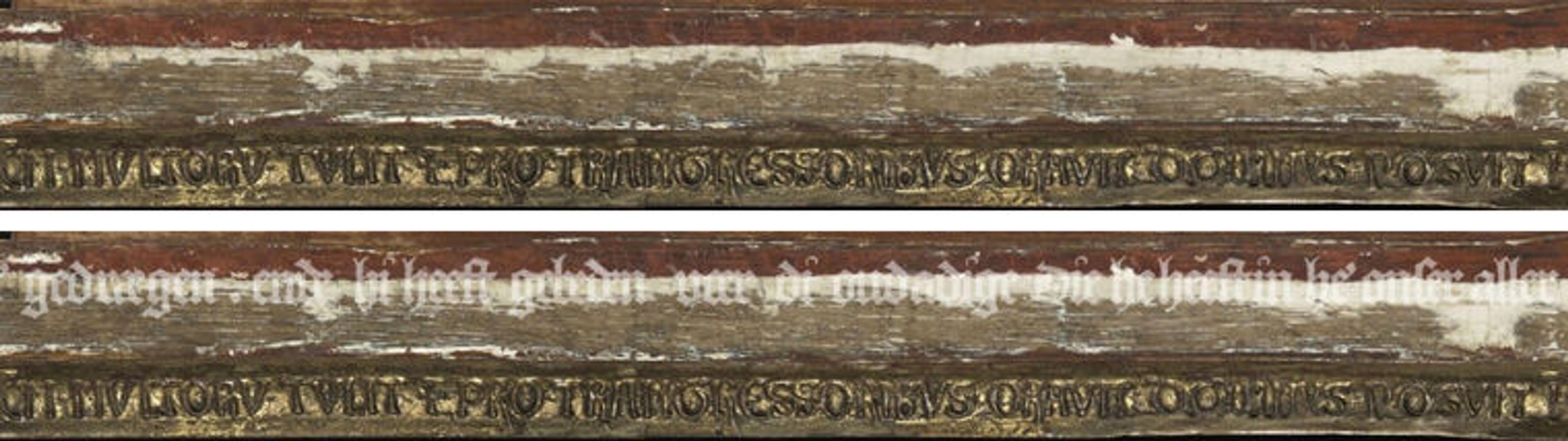 Once the inscriptions on the frames of the Crucifixion and Last Judgment had been uncovered, the problem was far from solved. A few words were clearly legible—just enough to show that the text, in a formal Gothic minuscule, was a Middle Dutch translation of the Latin biblical inscriptions presented in pastiglia (the technique in which gesso is built up into three-dimensional forms) on all sides of both frames.