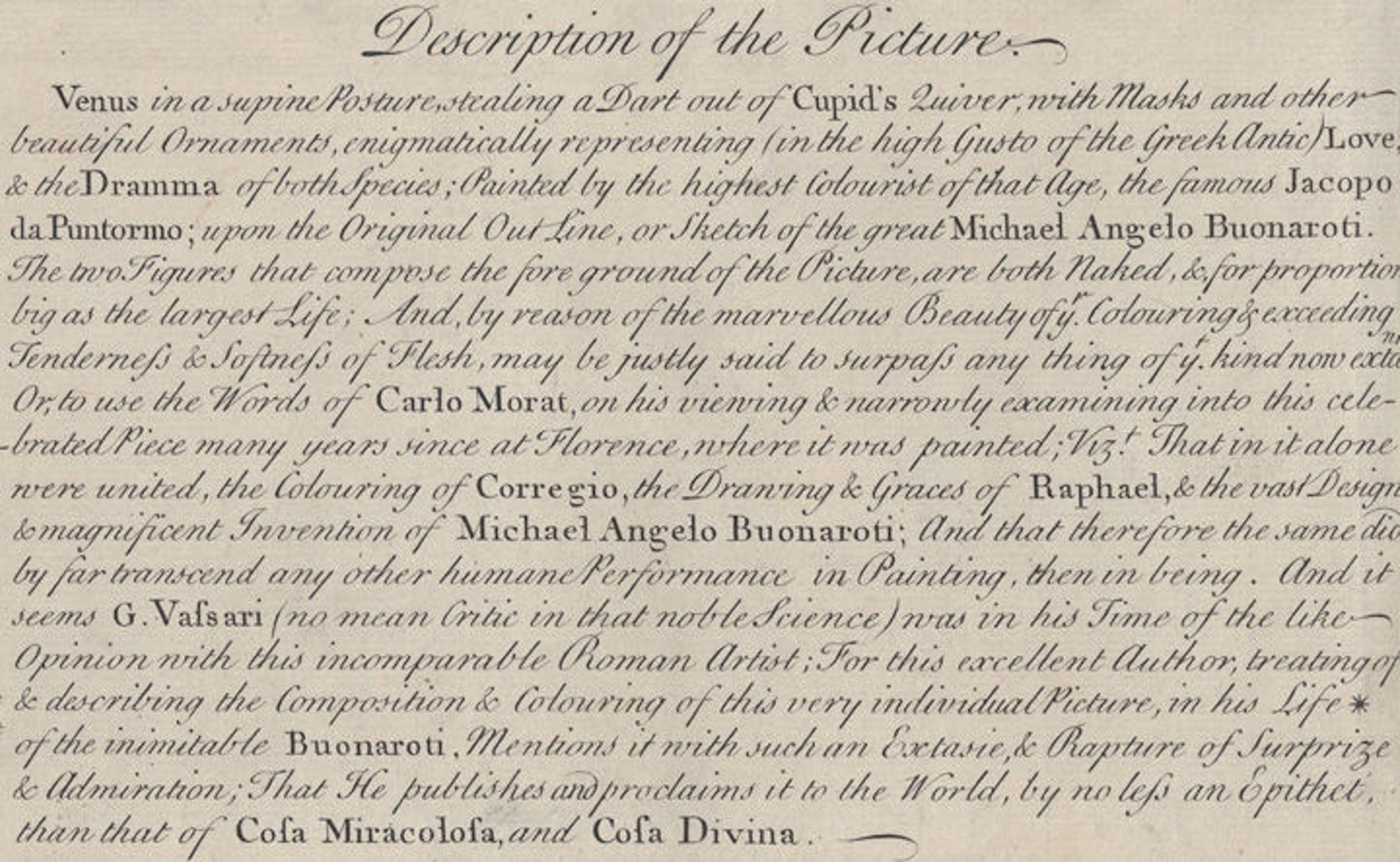 At least two of the original fifty raffle tickets survive, one of which is in The Met collection. The ticket includes the condition of the raffle (fig. 4), an elaborate description of the picture (fig. 5), and an etched illustration (fig. 6), which reveal that the owners supposed, or at least presented it to be the original panel by Jacopo da Pontormo. To add force to their argument, they invoked the words of the painter Carlo Maratta (1625–1713), who had supposedly inspected the panel for its authenticity, as well as the description of the artist and biographer Giorgio Vasari (1511–1574), who had mentioned it "with such an Extasie & Rapture of Surprize & Admiration" in his biography of Michelangelo as a "Cosa Miracolosa" and "Cosa Divina" ("a miraculous and divine thing").