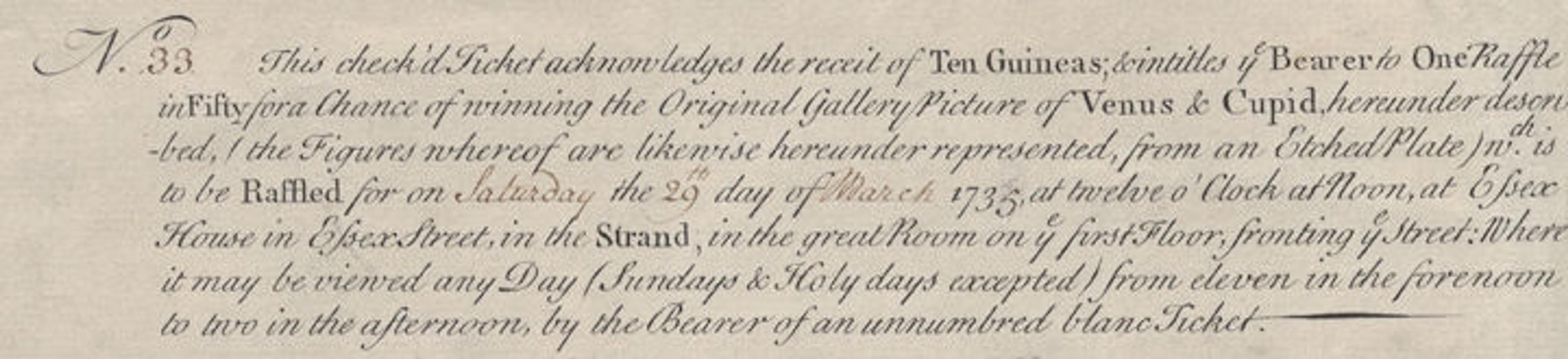Fig. 4. Raffle ticket for the painting of Venus and Cupid after Michelangelo (detail view of the terms of the raffle), 1734. Etching, additions in the text in pen and ink, sheet: 13 3/4 x 8 11/16 in. (35 x 22 cm). The Metropolitan Museum of Art, New York, The Elisha Whittelsey Fund, The Elisha Whittelsey Collection, 1959 (59.508.100)