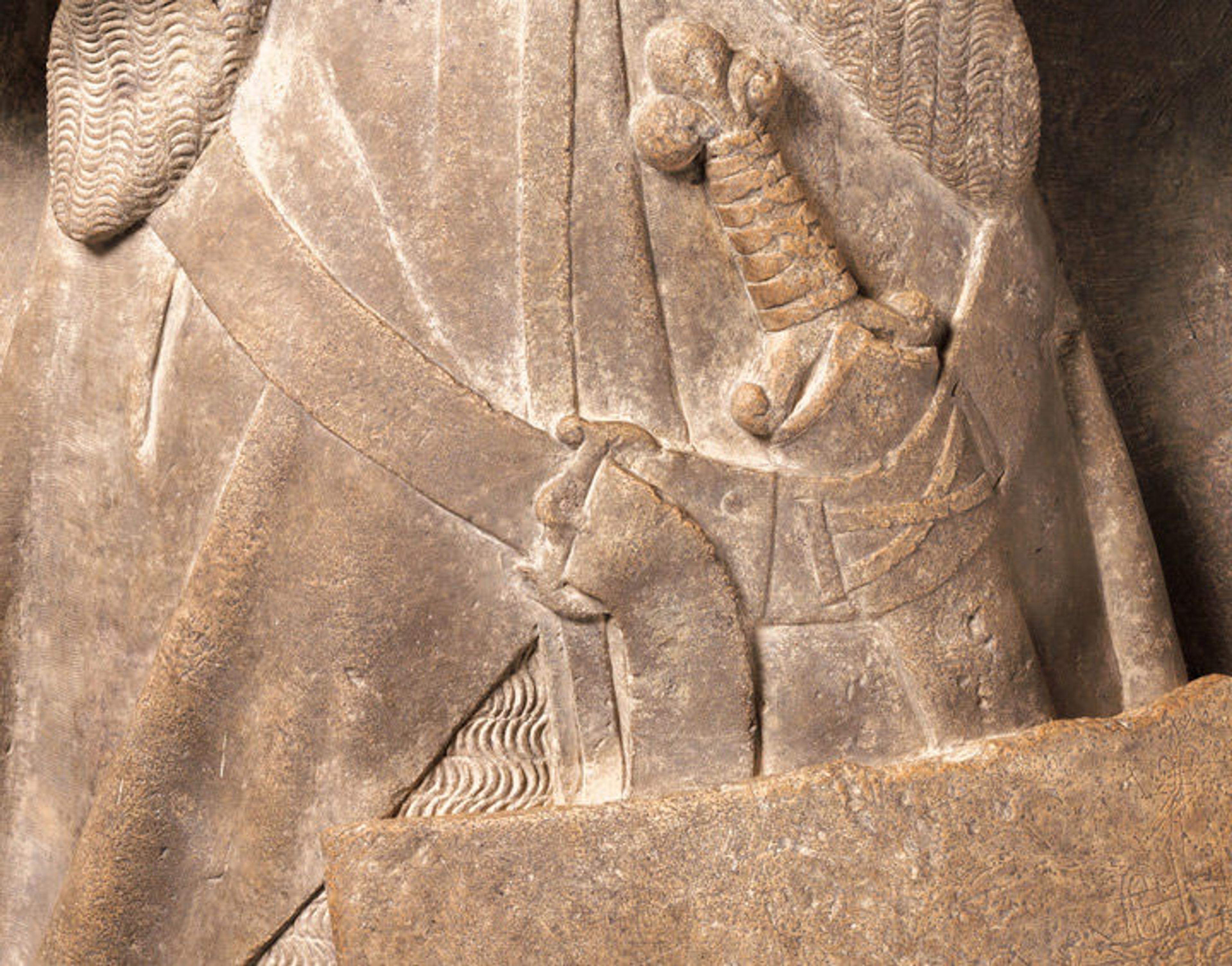 The sculpture was the subject of a yearlong conservation treatment to clean and consolidate the Apremont stone surface in preparation for its inclusion in the exhibition. Originally a tomb at the Cistercian Abbey of La Clarté-Dieu in Touraine, this knight has been identified as either Jean II d'Aluye or his son, Hugues VI, in conflicting sources. Three generations of d'Aluye men are documented as fighting in the Holy Land: Jean's father, Hugues V; Jean himself; and his son, Hugues VI. Depicted in his armor—complete with mail shirt, hood, mittens, chausses on his legs, and surcoat—the knight also has a shield and sword at his side. These items are all expected in an image of a 13th-century knight, but the sword's trilobite pommel is entirely unlike the common cruciform hilts seen in European swords of the period. Helmut Nickel identified the sword as Chinese in origin based on the pommel and the grip wrapping. [1]