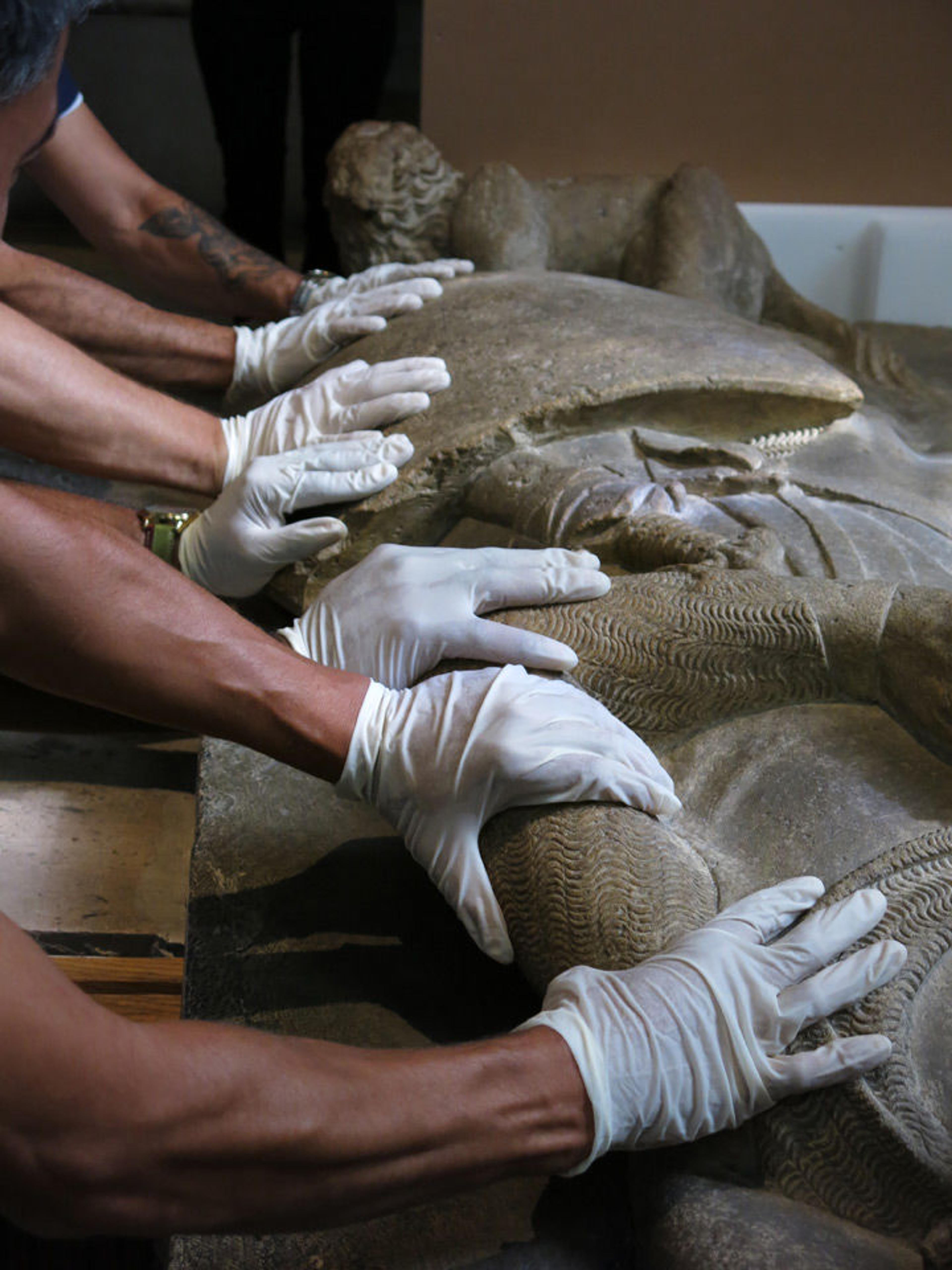 Art handlers prepare to slide the effigy into its packing crate. Photo by Lucretia Kargère
