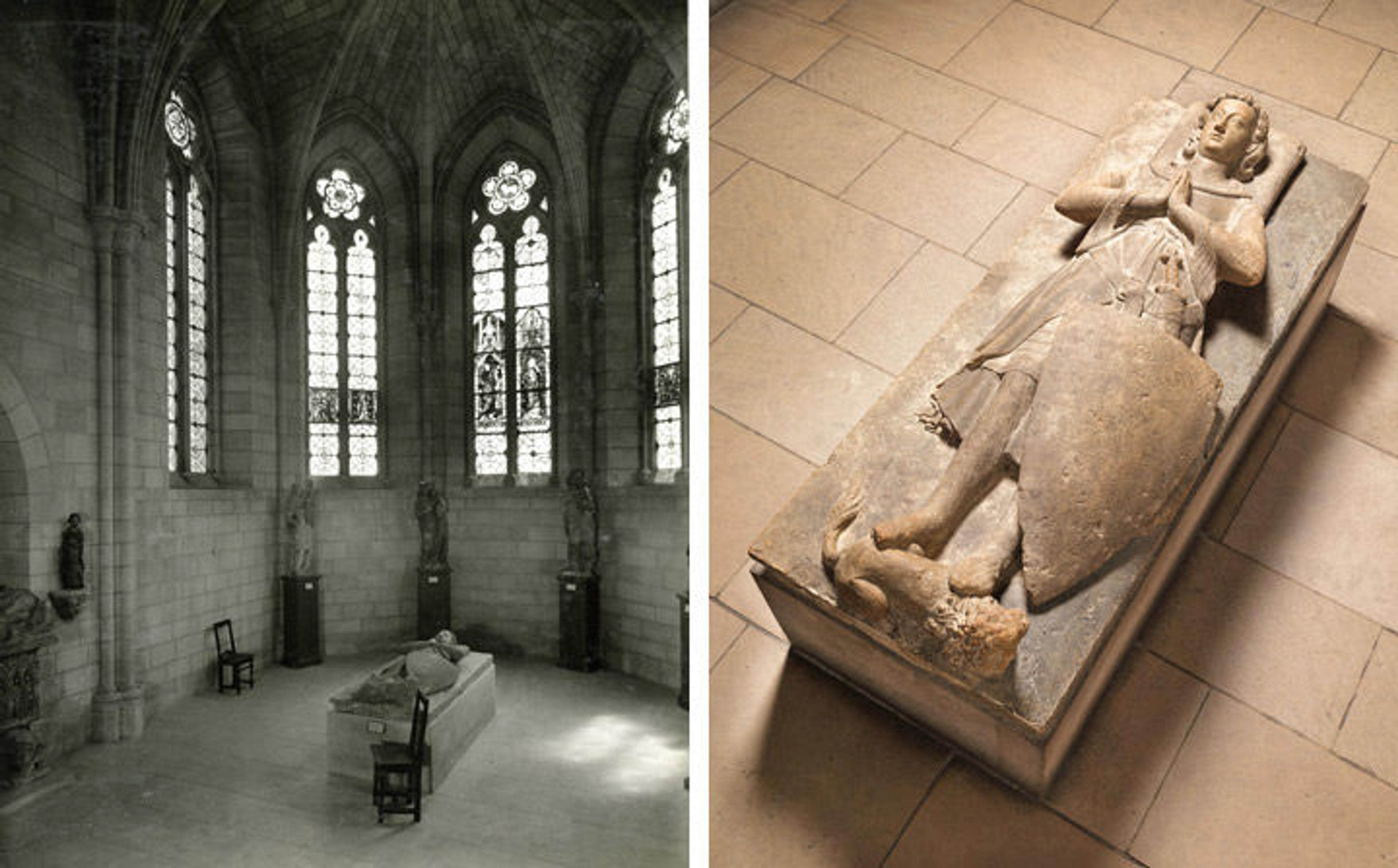 Left: The sculpture as installed in the Gothic Chapel, taken just before the opening of The Met Cloisters in May 1938. The Metropolitan Museum of Art, The Cloisters: Photographs 1938. New York, 1938. Right: Knight of the d'Aluye family, after 1248–by 1267. Limestone, 13 x 33 1/2 x 83 1/2 in. (33 x 85.1 x 212.1 cm). The Metropolitan Museum of Art, New York, The Cloisters Collection, 1925 (25.120.201)