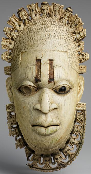 Left: Queen Mother Pendant Mask: Iyoba, 16th Century. Nigeria, Court of Benin. Edo peoples. Ivory, iron, copper (?), H. 9 3/8 x W. 5 x D. 3 1/4 in. (23.8 x 12.7 x 8.3 cm). The Metropolitan Museum of Art, New York, The Michael C. Rockefeller Memorial Collection, Gift of Nelson A. Rockefeller, 1972 (1978.412.323)