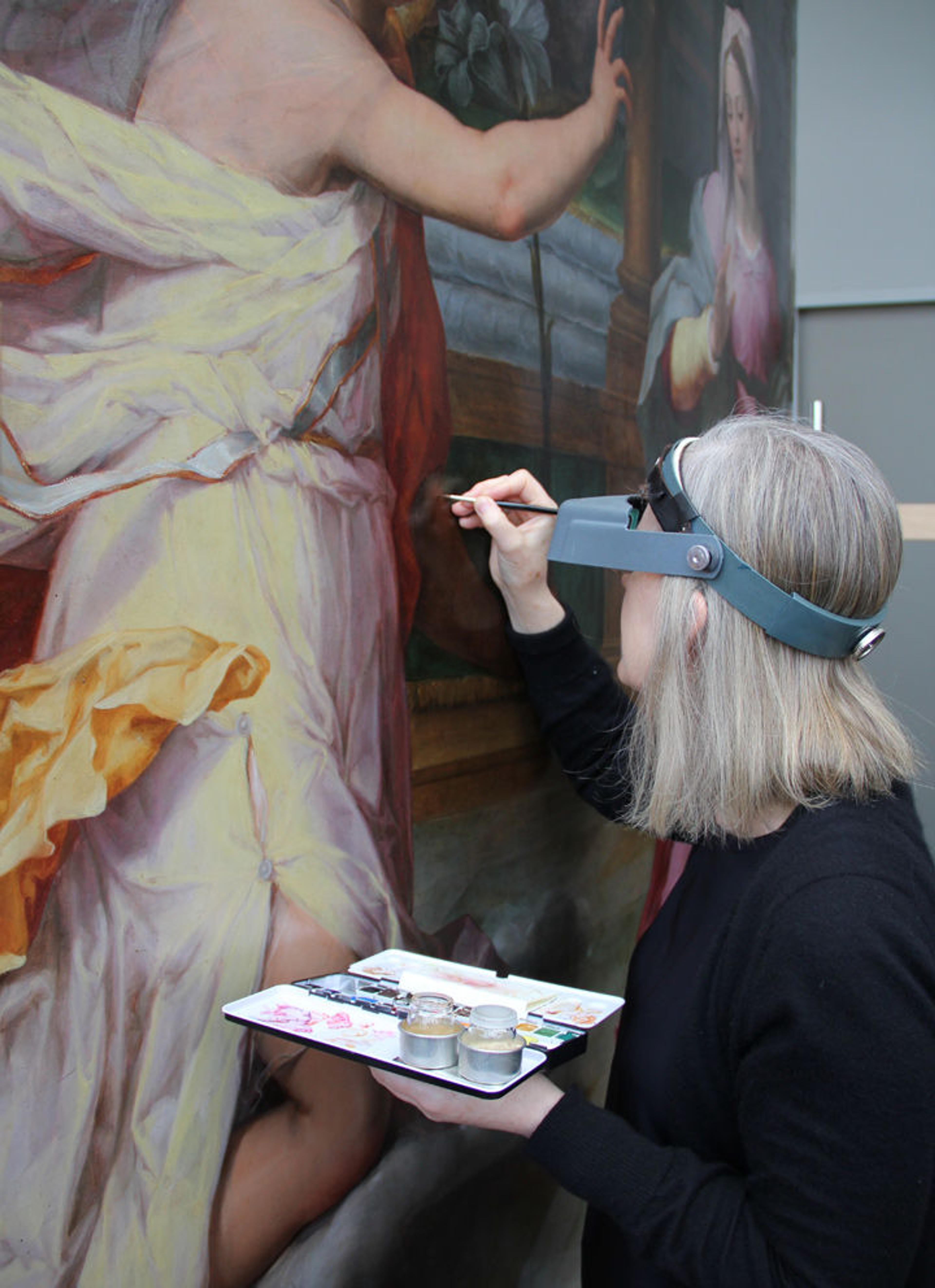Conservator Charlotte Hale in-painting Peter Candid's The Annunciation. Photo by the author