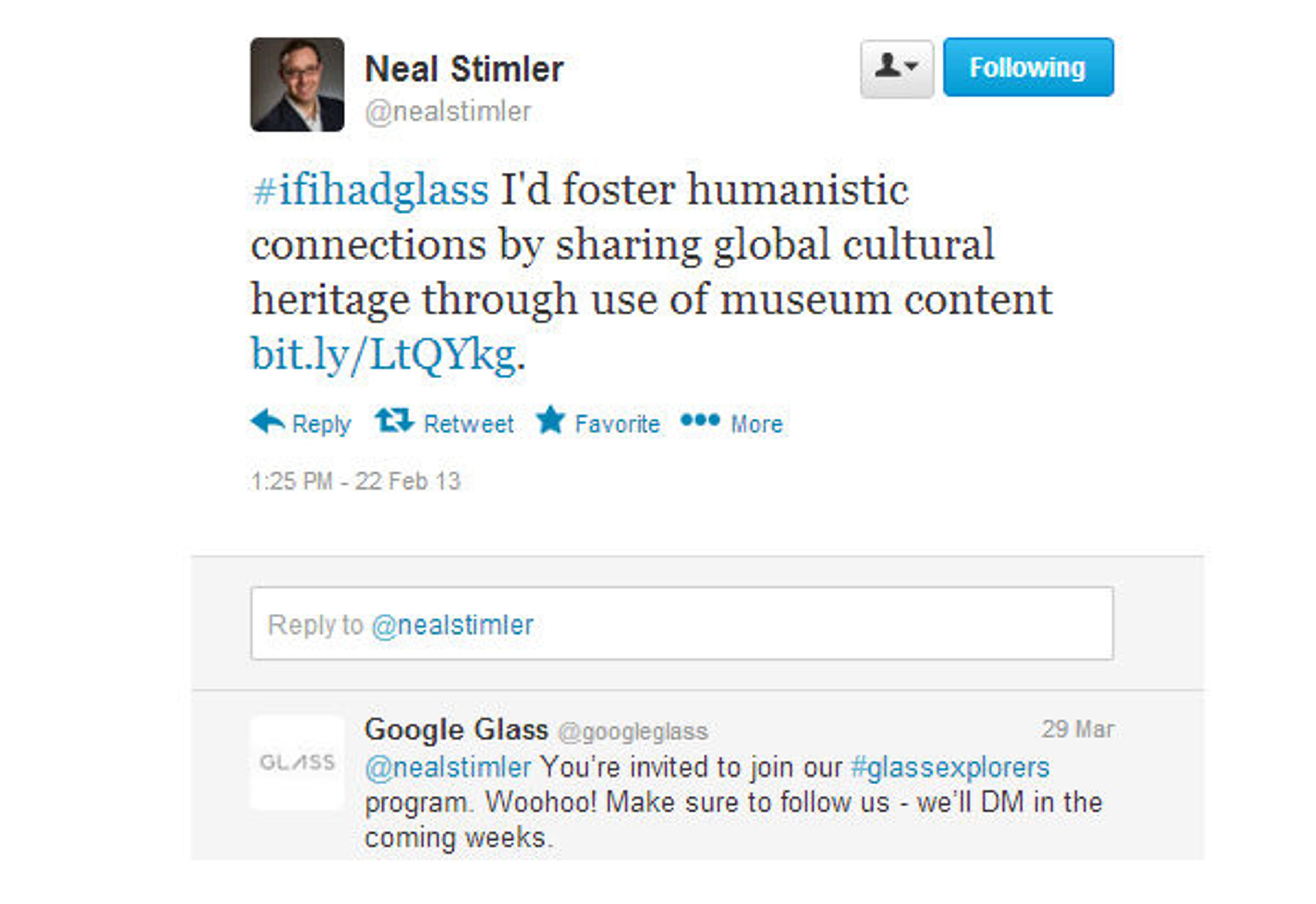 With the full support of the Museum, I received Google Glass in July 2013 and became one of thousands of worldwide Google Glass Explorers tasked with bringing the product into my community and testing its application in my life and work. In addition to providing feedback to Google, Glass Explorers are encouraged to share their experiences in a forum and on the Glass Explorers Google+ community, as well as on other social media platforms.