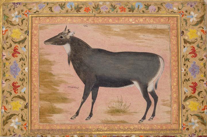 Painting by Mansur (active ca. 1589–1626). "Study of a Nilgai (Blue Bull)," Folio from the Shah Jahan Album, ca. 1620. Attributed to India. Ink, opaque watercolor, and gold on paper, H. 15 5/16 in. (38.9 cm), W. 10 1/16 in. (25.6 cm). The Metropolitan Museum of Art, New York, Purchase, Rogers Fund and The Kevorkian Foundation Gift, 1955 (55.121.10.13)