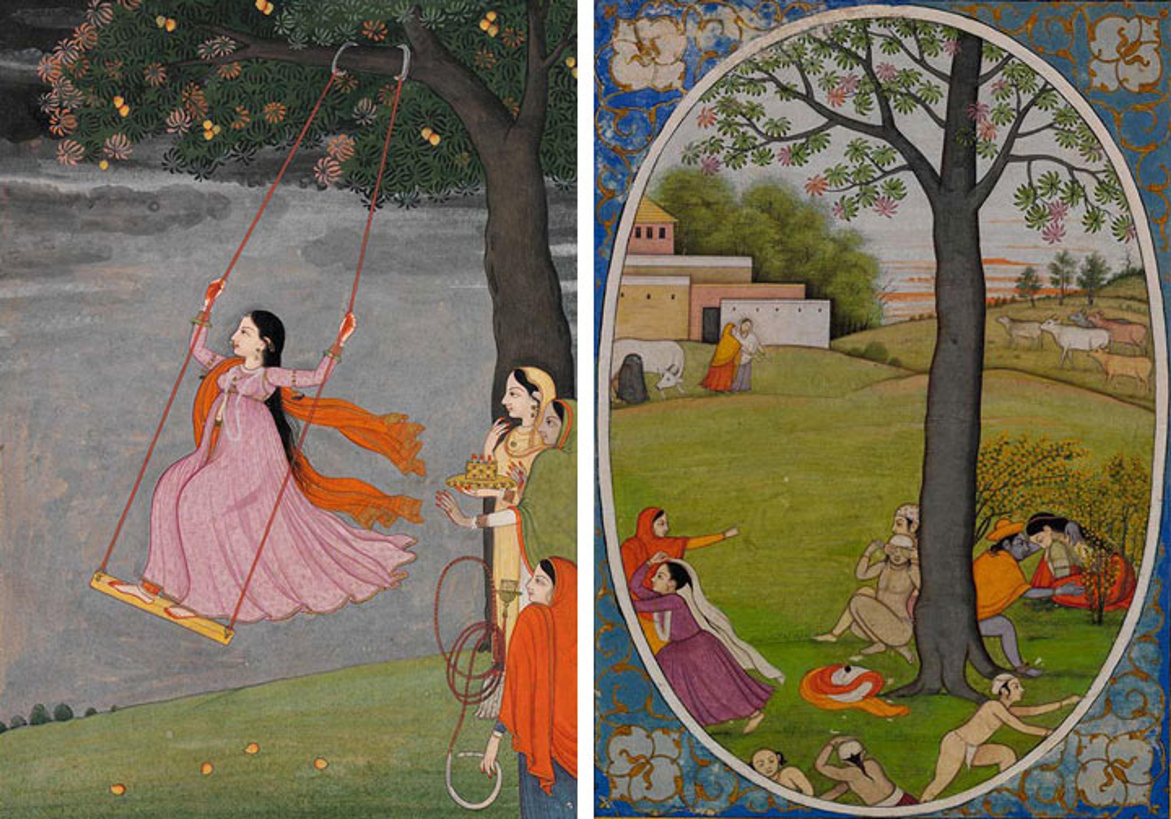 Left: A Lady on a Swing in the Monsoon, ca. 1750–75. India, Punjab Hills. Opaque watercolor and gold on paper; Page: H. 8 1/2 in. (21.6 cm), W. 6 5/16 in. (16 cm); Painting: H. 7 1/8 in. (18.1 cm), W. 5 in. (12.7 cm). Promised Gift of the Kronos Collections, 2015. Right: Fattu. "The Villagers Play Hide and Seek; Krishna Discovers Radha Hidden in a Clump of Bushes," Folio from the "Kangra Bihari" Sat Sai (Seven Hundred Verses), ca. 1785. India, Kangra, Punjab Hills. Opaque watercolor, ink, and gold on paper; Page: H. 8 1/8 in. (20.6 cm), W. 6 in. (15.2 cm); Painting: H. 7 7/16 in. (18.9 cm), W. 5 1/4 in. (13.3 cm). Promised Gift of the Kronos Collections, 2015