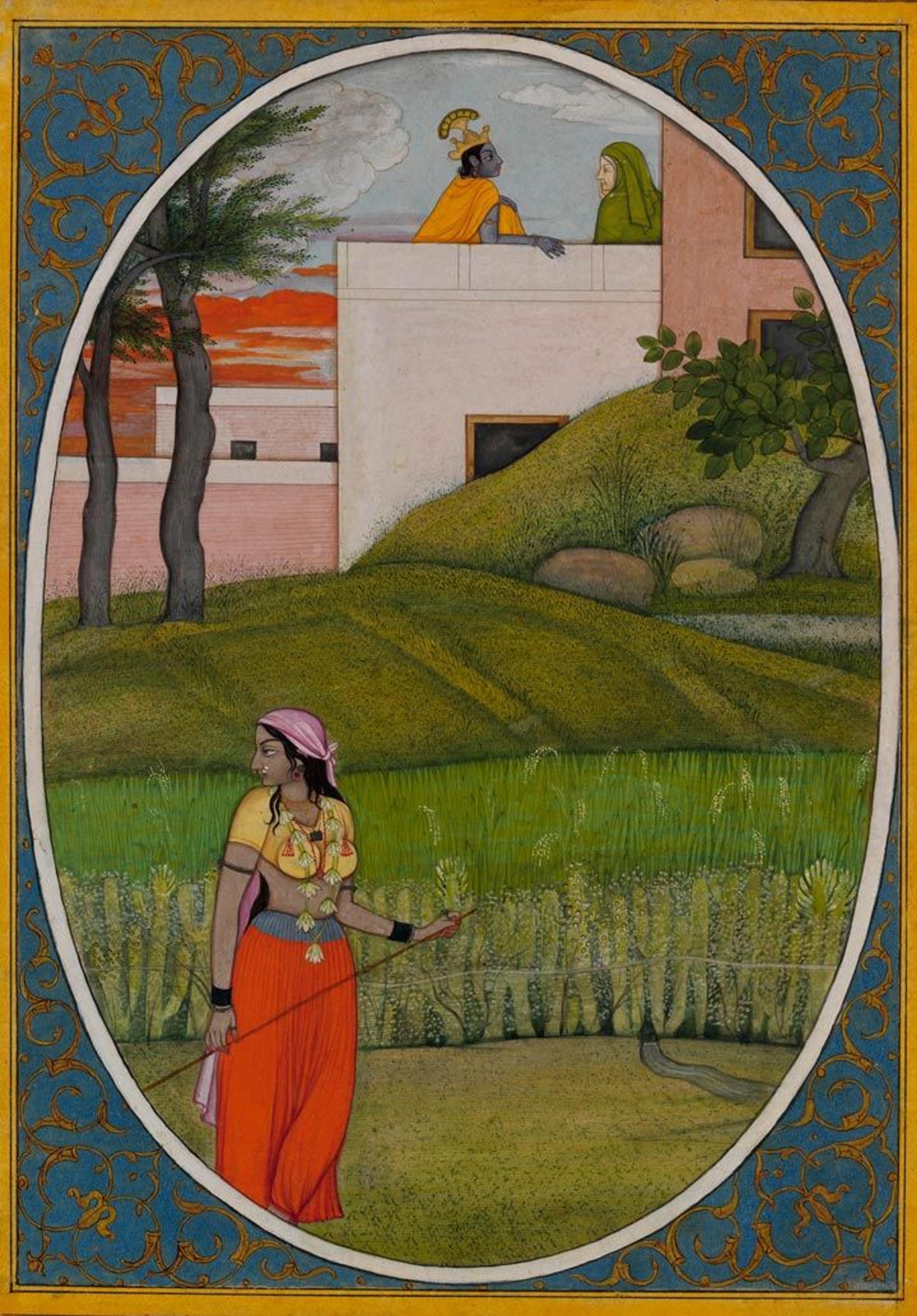 "The Village Beauty," Folio from the dispersed "Kangra ‘Bihari" Sat Sai (Seven Hundred Verses), ca. 1785. India, Kangra, Punjab Hills. Opaque watercolor, ink, and gold on paper; Page: H. 8 1/8 in. (20.6 cm), W. 5 7/8 in. (14.9 cm); Painting: H. 7 3/8 in. (18.7 cm), W. 5 3/16 in. (13.2 cm). Promised Gift of the Kronos Collections, 2015