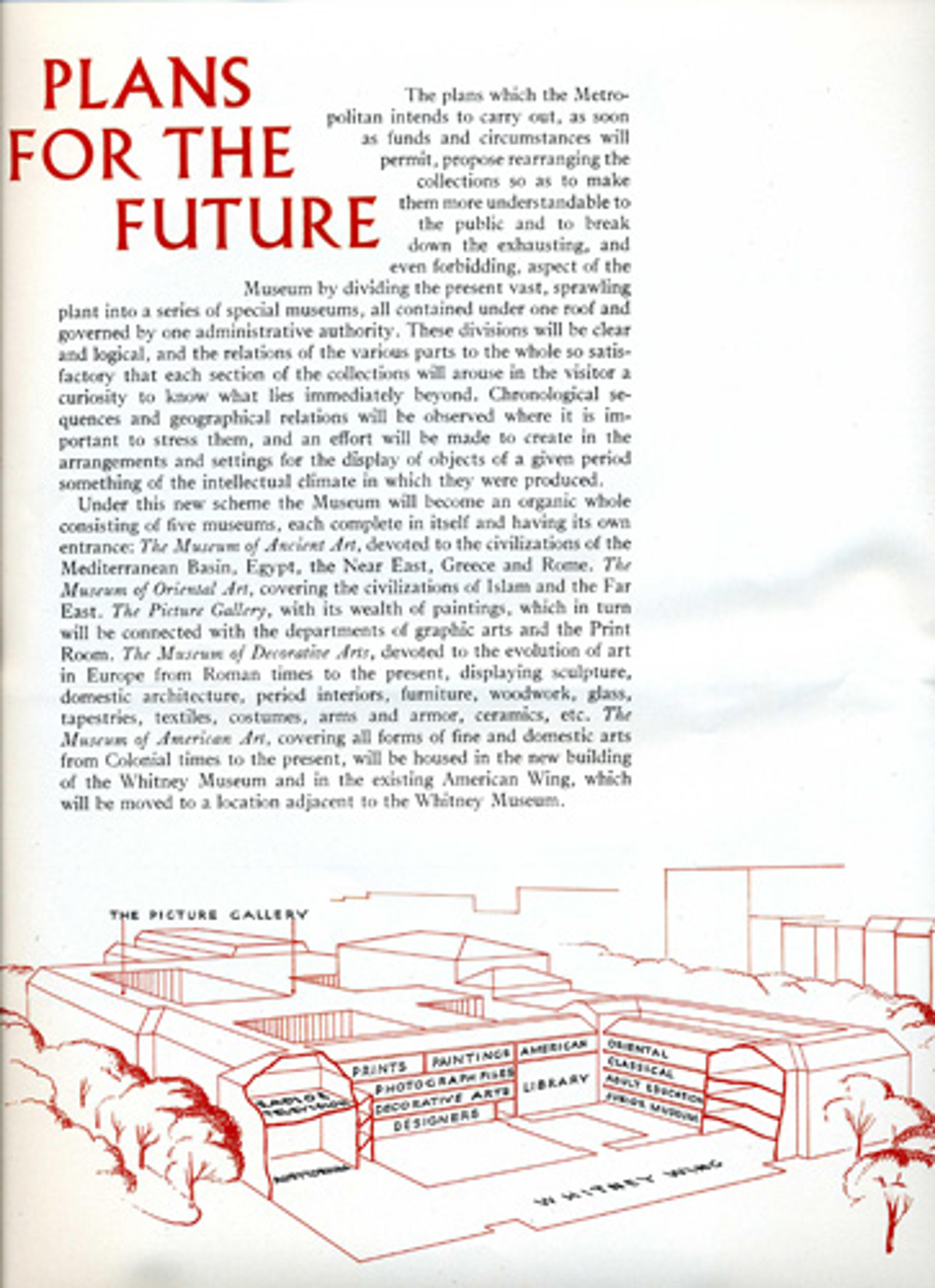 Watson then outlined an ambitious plan to transform the institution into five separate museums under one roof. Each would be a stand-alone museum with its own entrance. In a 1946 brochure the Museum elaborated its intentions for the projected new wings, which included a possible collaboration with the Whitney Museum of American Art.