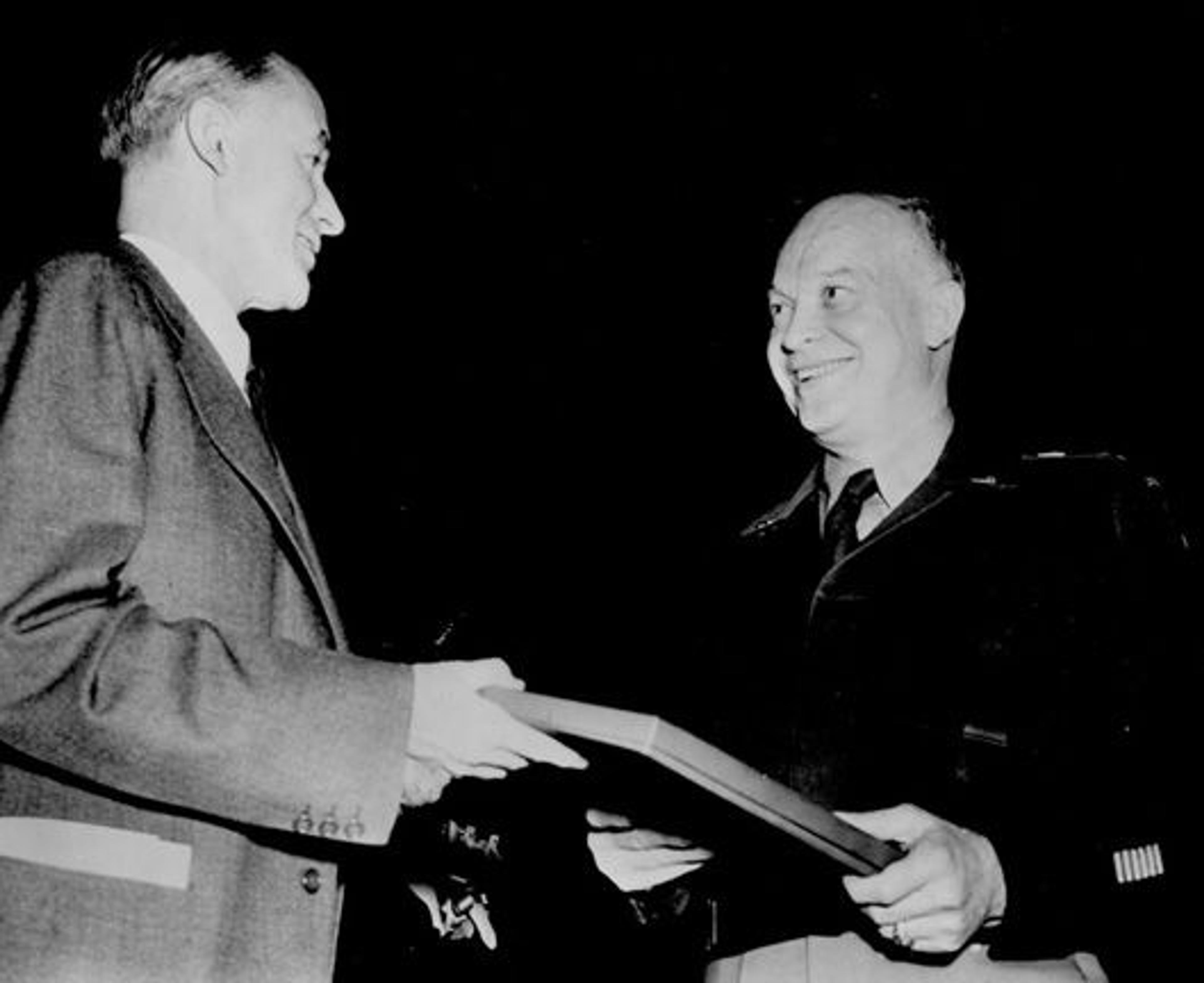 General Eisenhower receiving an honorary Fellow for Life award from Roland Redmond, vice president of the Board of Trustees of the Metropolitan Museum, April 2, 1946