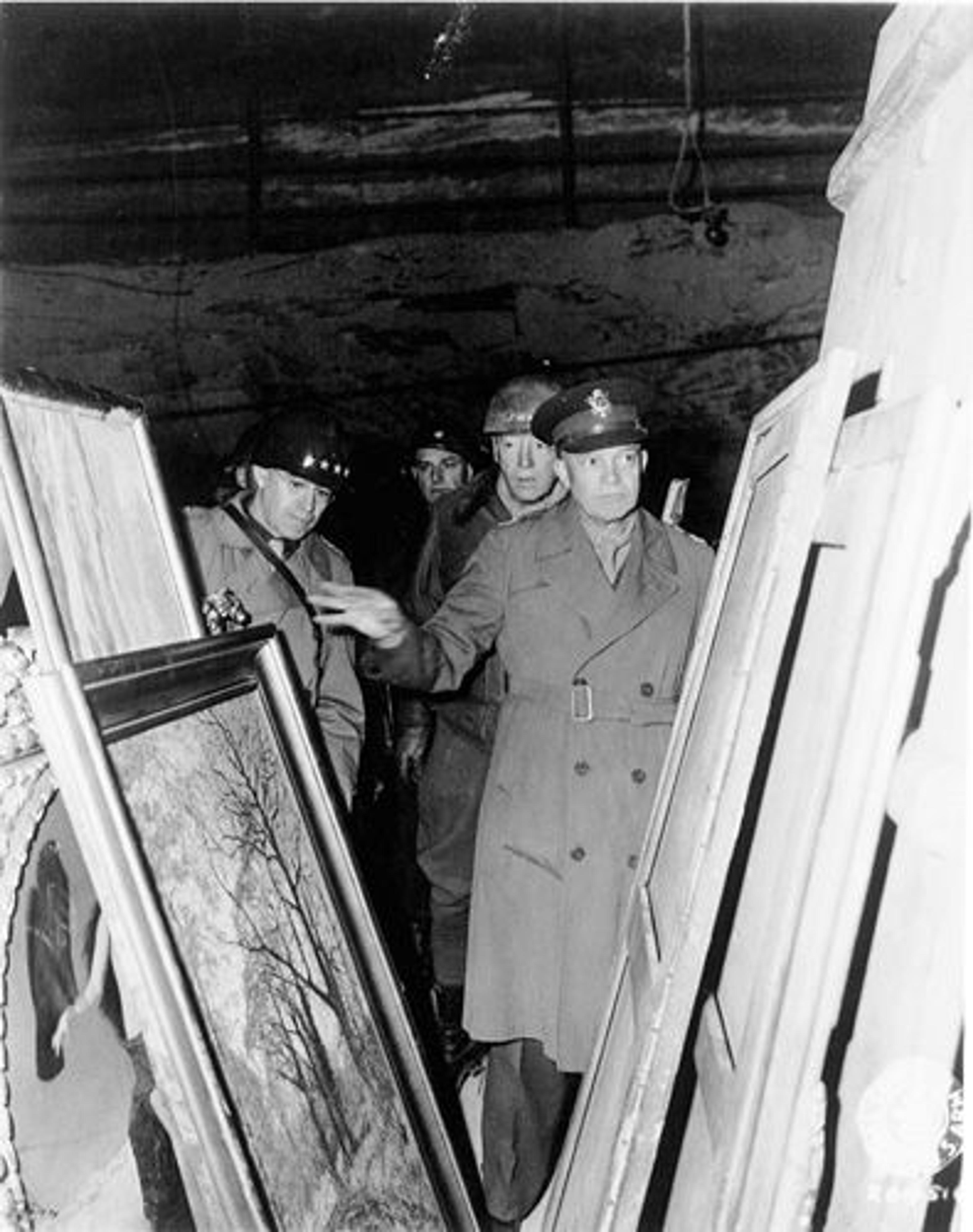 Left: April 12, 1945: General Eisenhower, supreme Allied commander, inspects art treasures looted by the Nazis and stored away in the Merkers salt mine. Behind Eisenhower are General Omar N. Bradley (left), commanding general of the Twelfth Army Group, and Lt. Gen. George S. Patton Jr. (right), commanding general, Third U.S. Army. National Archives and Records Administration, RG 111-SC-204516